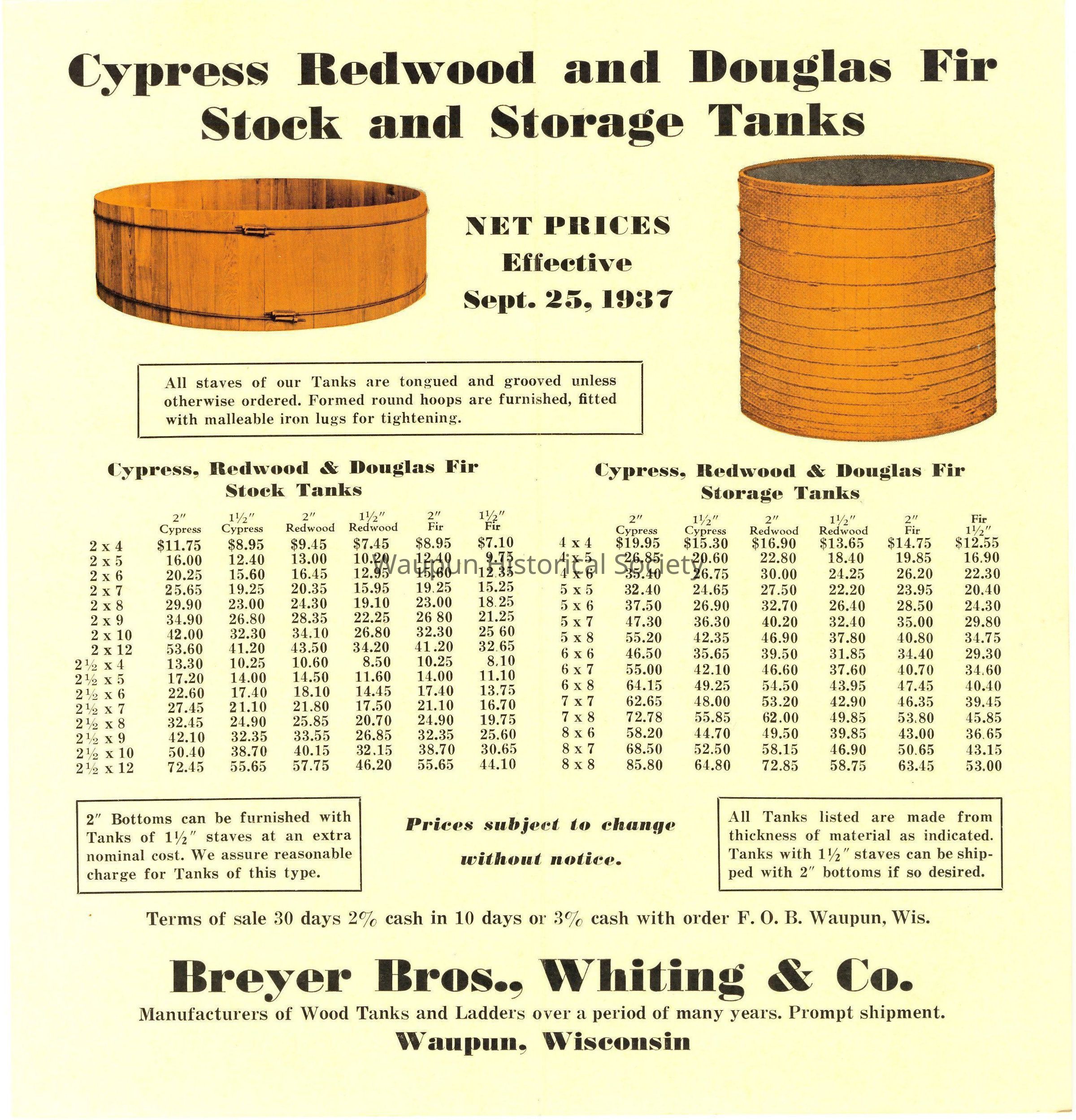 It opens to: Cypress Redwood and Douglas Fir Stock and Storage Tanks - Net Prices Effective Sept. 25, 1937.