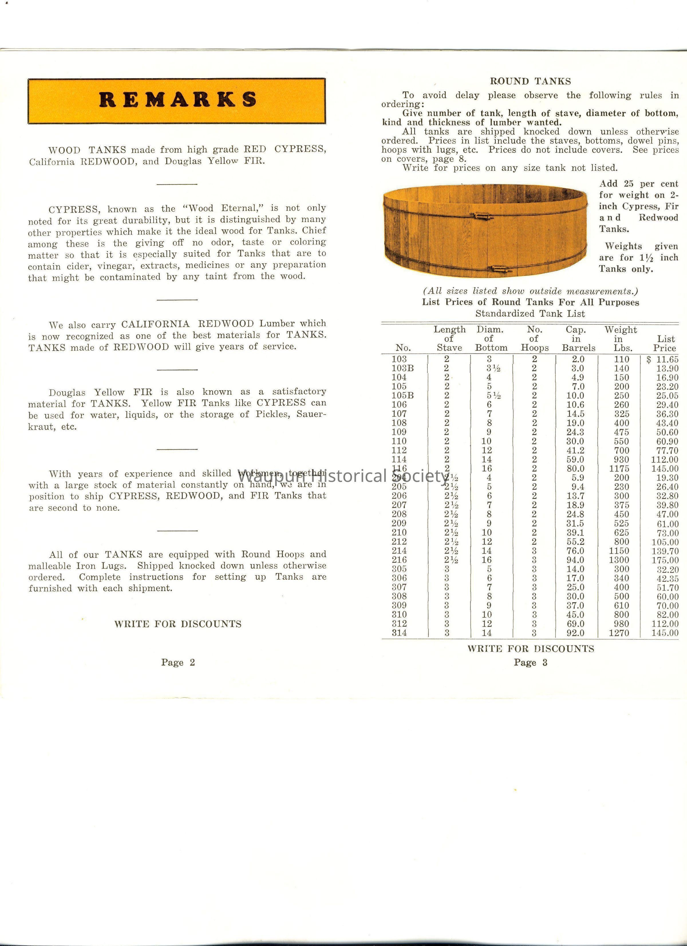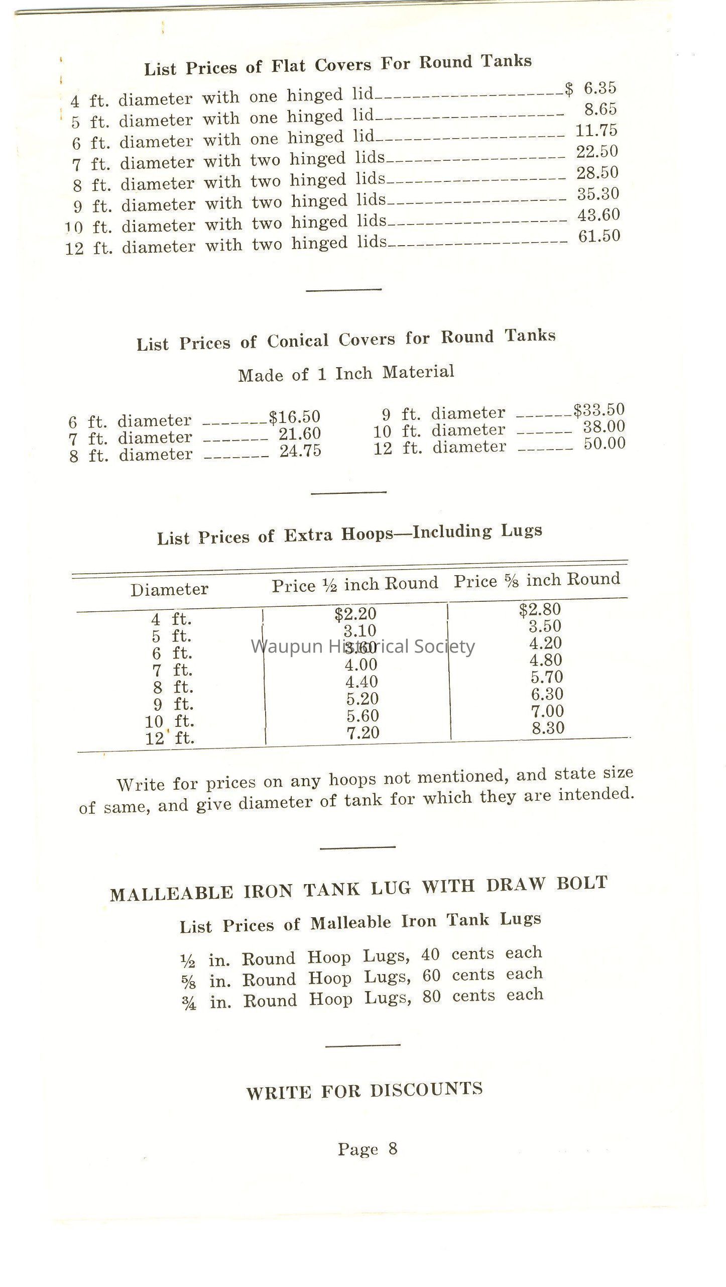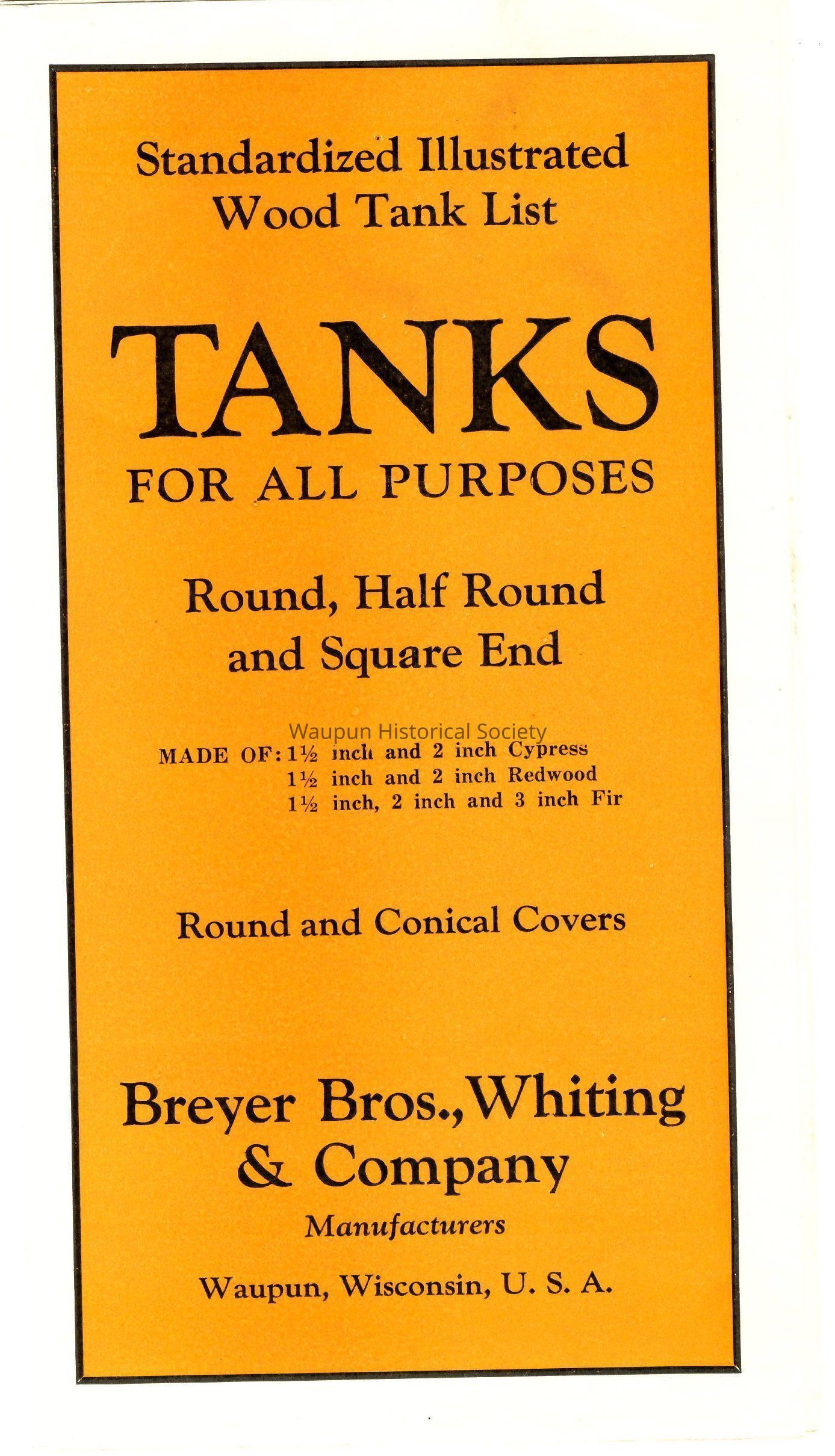 This pamphlet lists types, sizes, shapes and prices of tanks available manufactured by Breyer Bros., Whiting & Co., Waupun, Wis.Acquisition