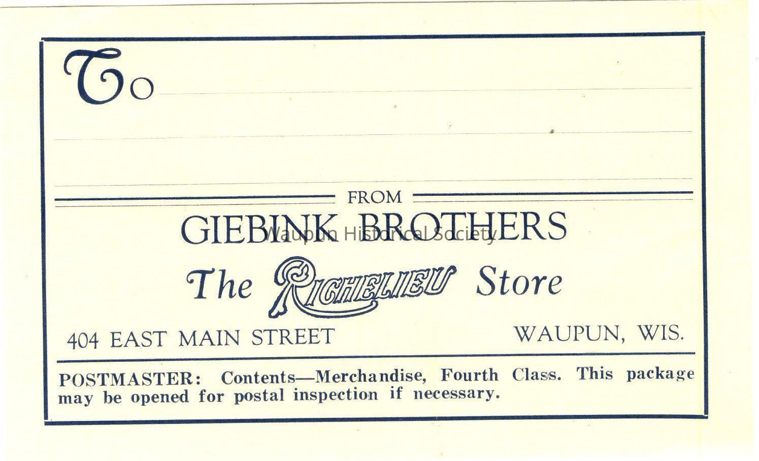 Shipping Label used by - Giebink Brothers, The Richelieu Store, 404 East Main Street, Waupun, Wis.
