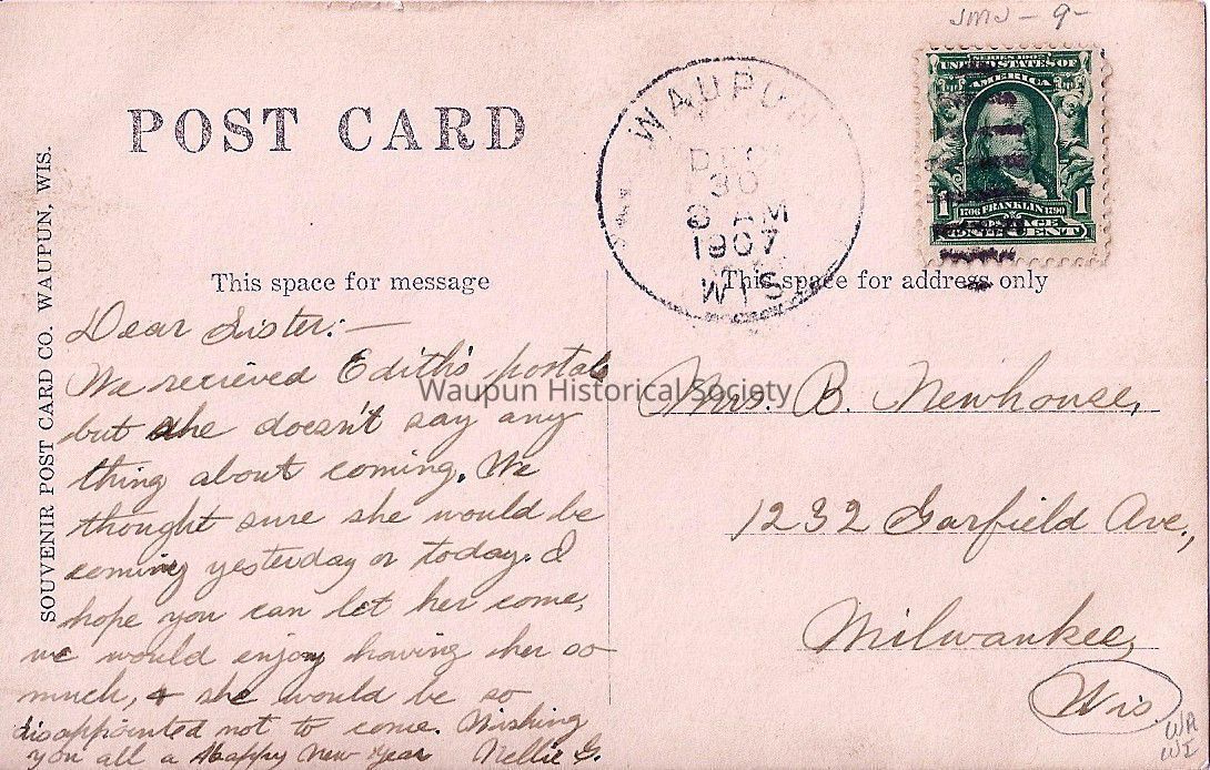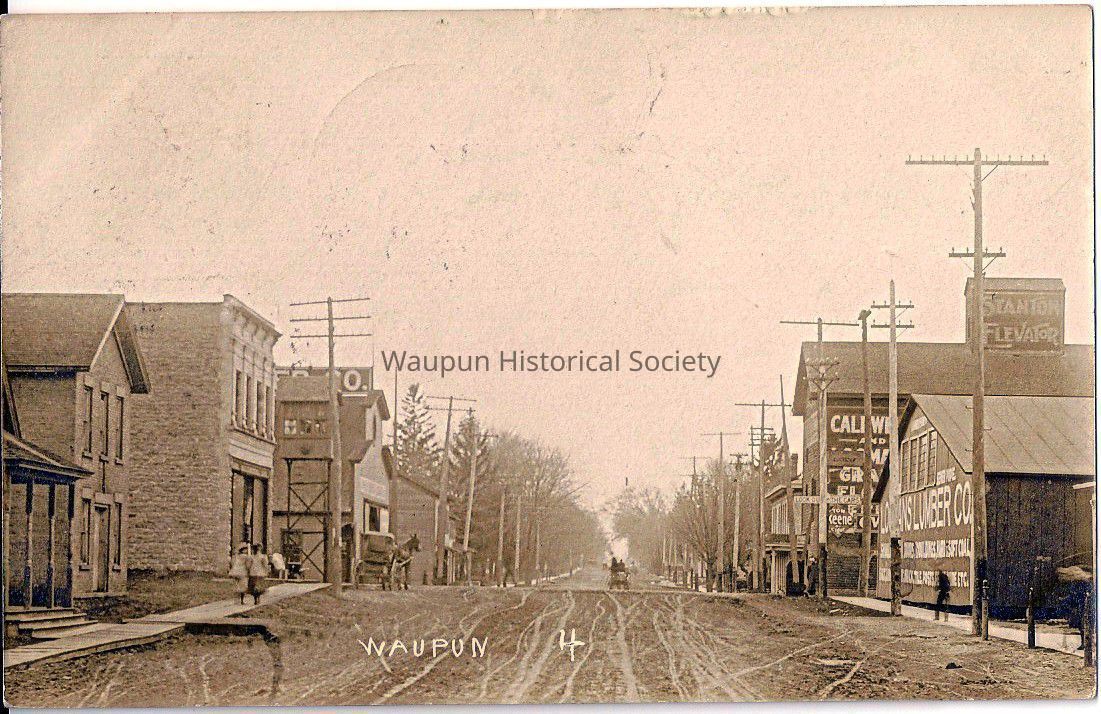 Postcard, showing the west end of Main Street. On the right side of the postcard can be seen the mill, a lumber company and the Commercial Hotel property. On the left side of the postcard can be seen several home and business that have been destroyed to make room for National Rivet. Notice the horse and carriage on the middle of the street and waiting on the lest side of the photo. The hotel can be seen beyond the horse and carriage. The top part of the mill on the left has been removed, it is difficult to say if that building still exists. I would also call attention to the mud streets and board sidewalks. The postcard was sent December 30, 1907.Acquisition