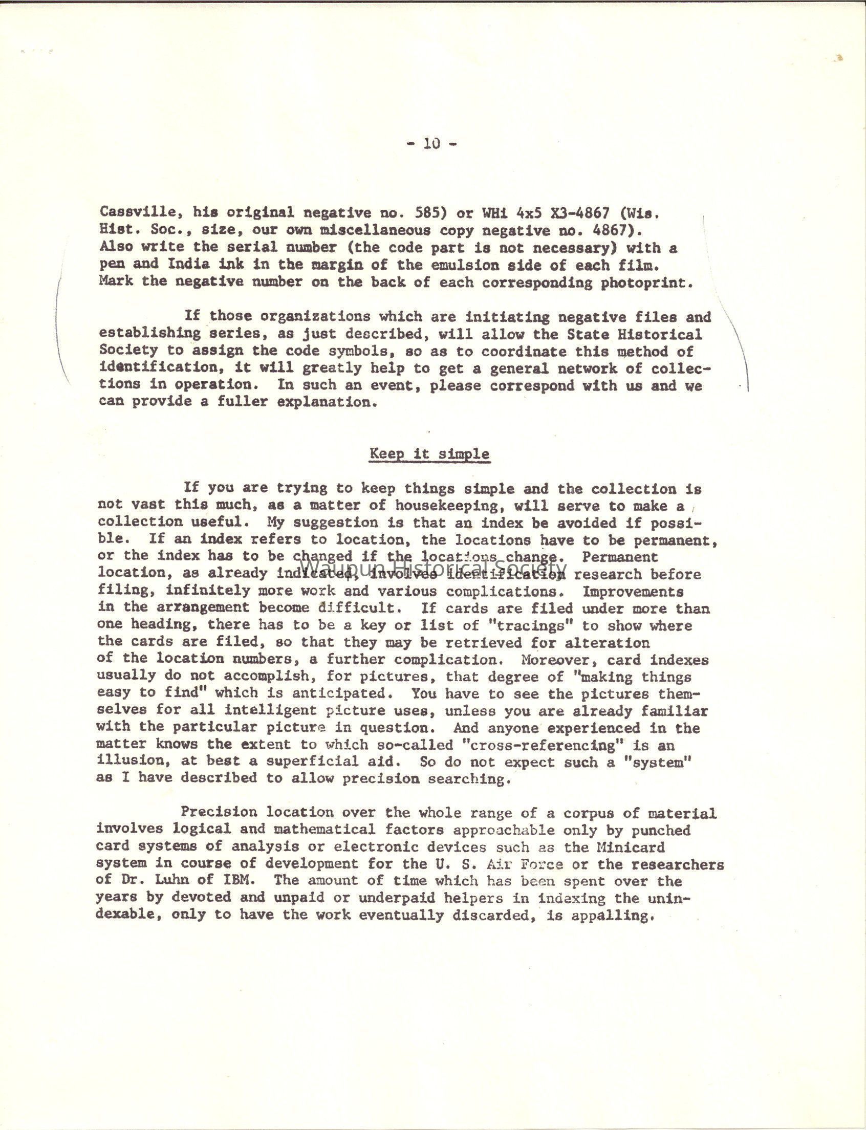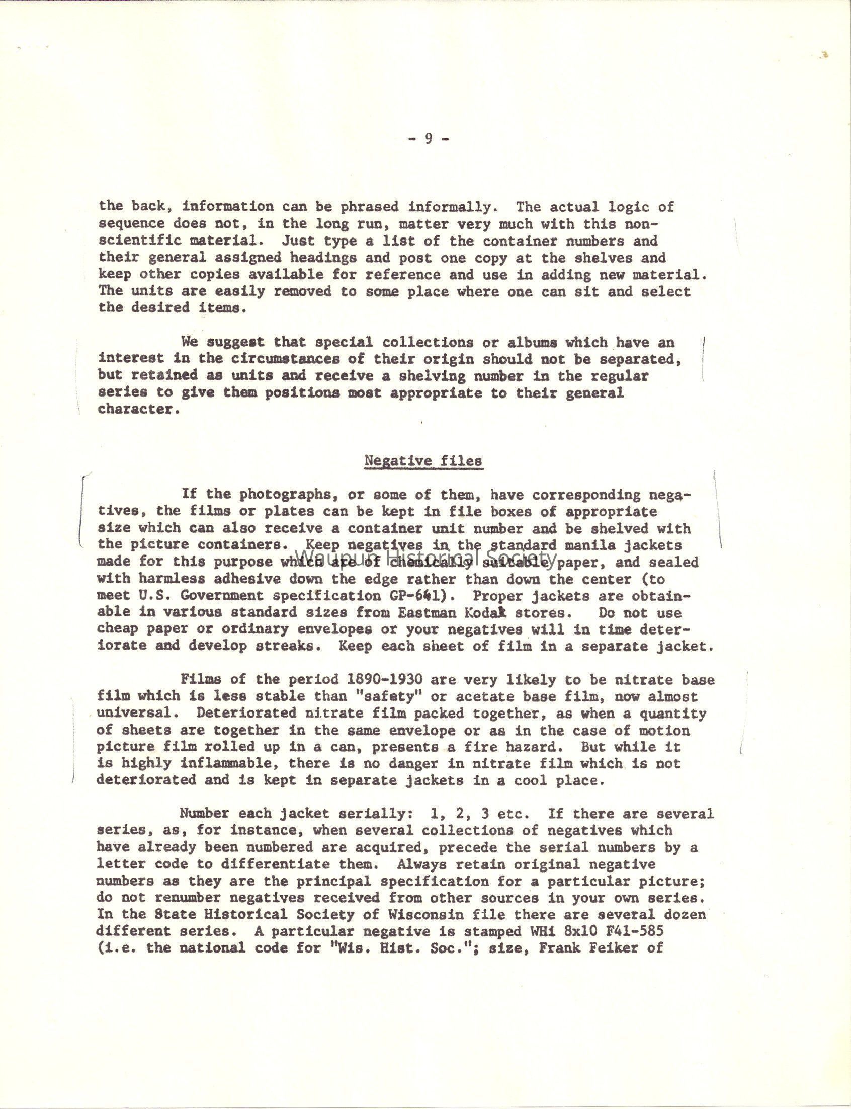 If those organizations which are initiating negative files and establishing series, as just described, will allow the State Historical Society to assign the code symbols, so as to coordinate this method of identification, it will greatly help to get a general network of collections in operation. In such an event, please correspond with us and we can provide a fuller explanation.
