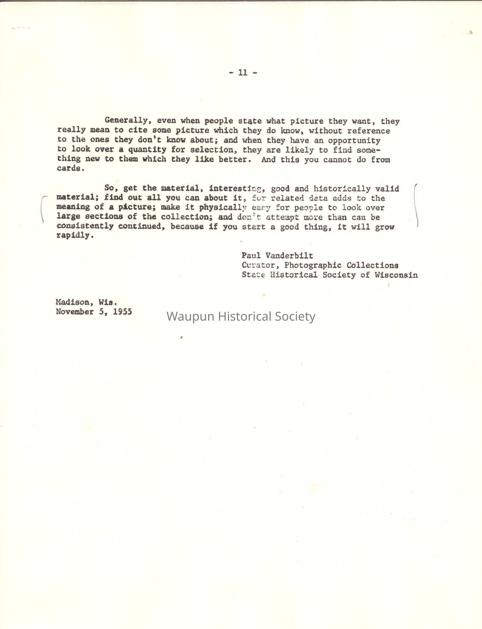Finally, and this is the aspect which most concerns historical societies, pictures form a permanent record upon which research can be based. Pictures from a variety of sources, perhaps scattered all over the country, and perhaps including your collection, are sought to incorporate in major exhibitions and to illustrate forthcoming books and articles. As this is written, I have on my desk requests for help in locating pictures useful in connection with a centennial of the undertaking profession, with a textbook on municipal government, with a historical treatment of Chippewa County, with a history of the labor movement, with a general program on the achievements of women in Wisconsin. And there are similar matters every week. A large collection, or rather a selectively intensive one, will often be the starting point of a book or program, where a researcher uses the picture for the initial determination of content, and this, we think is the most desirable situation of all.