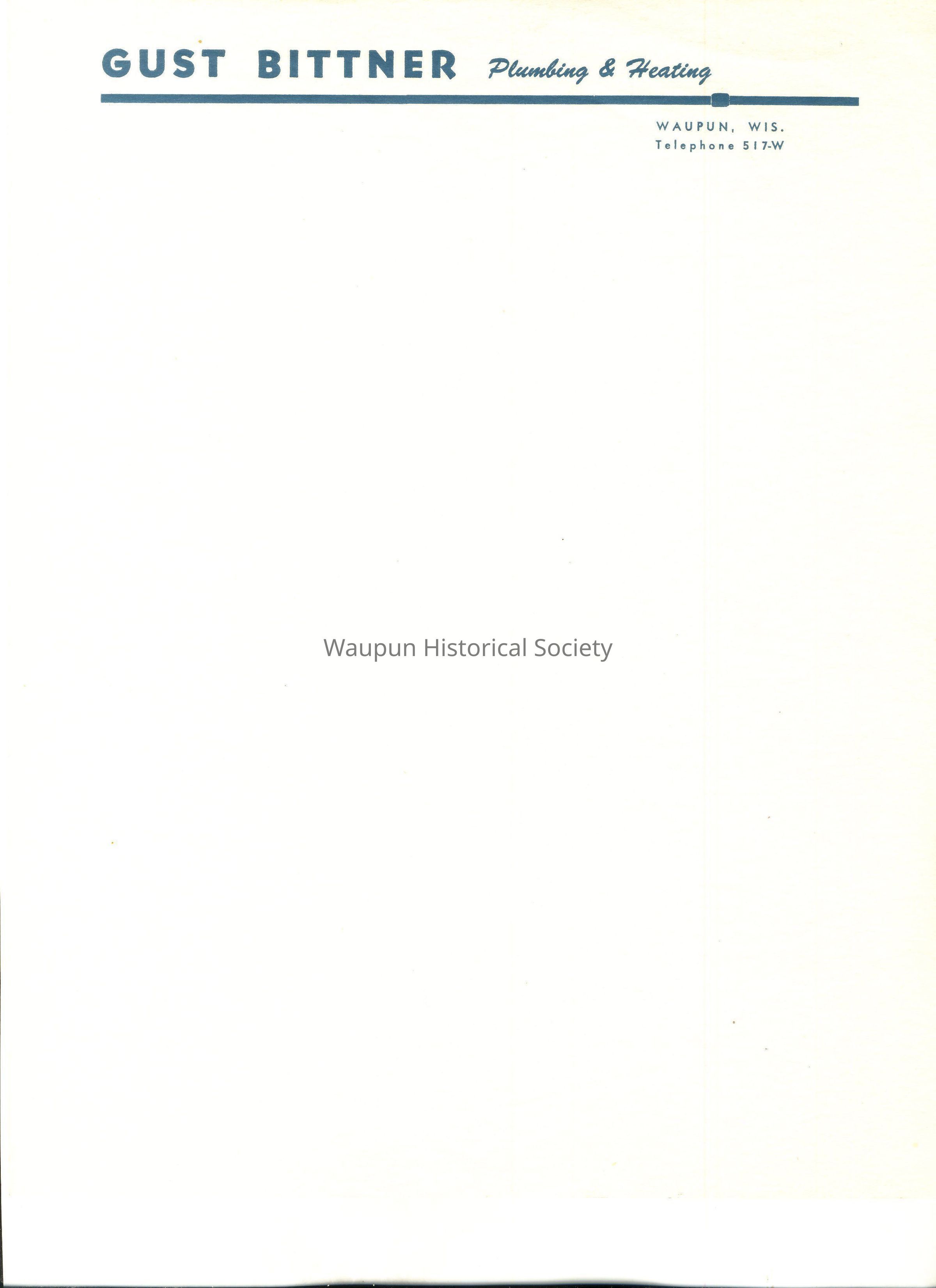 Letterhead from Gust Bettner - Pumbling & Heating - Waupun, Wis., Telephone 517-W