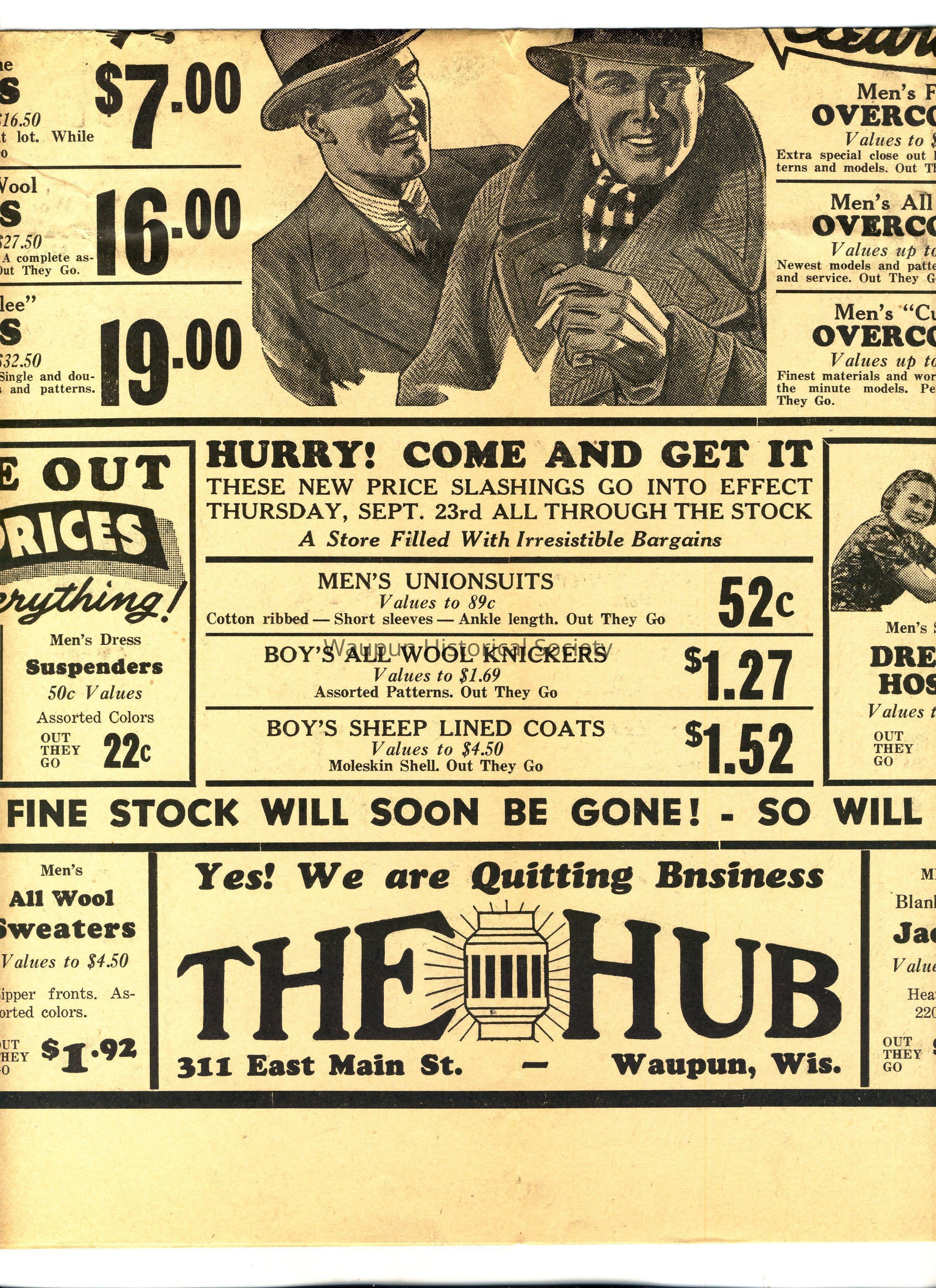 1 - Newspaper type announcement of THE HUB, Price Slashing Sale - Quitting the Business, 311 East Main St., Waupun, Wis.