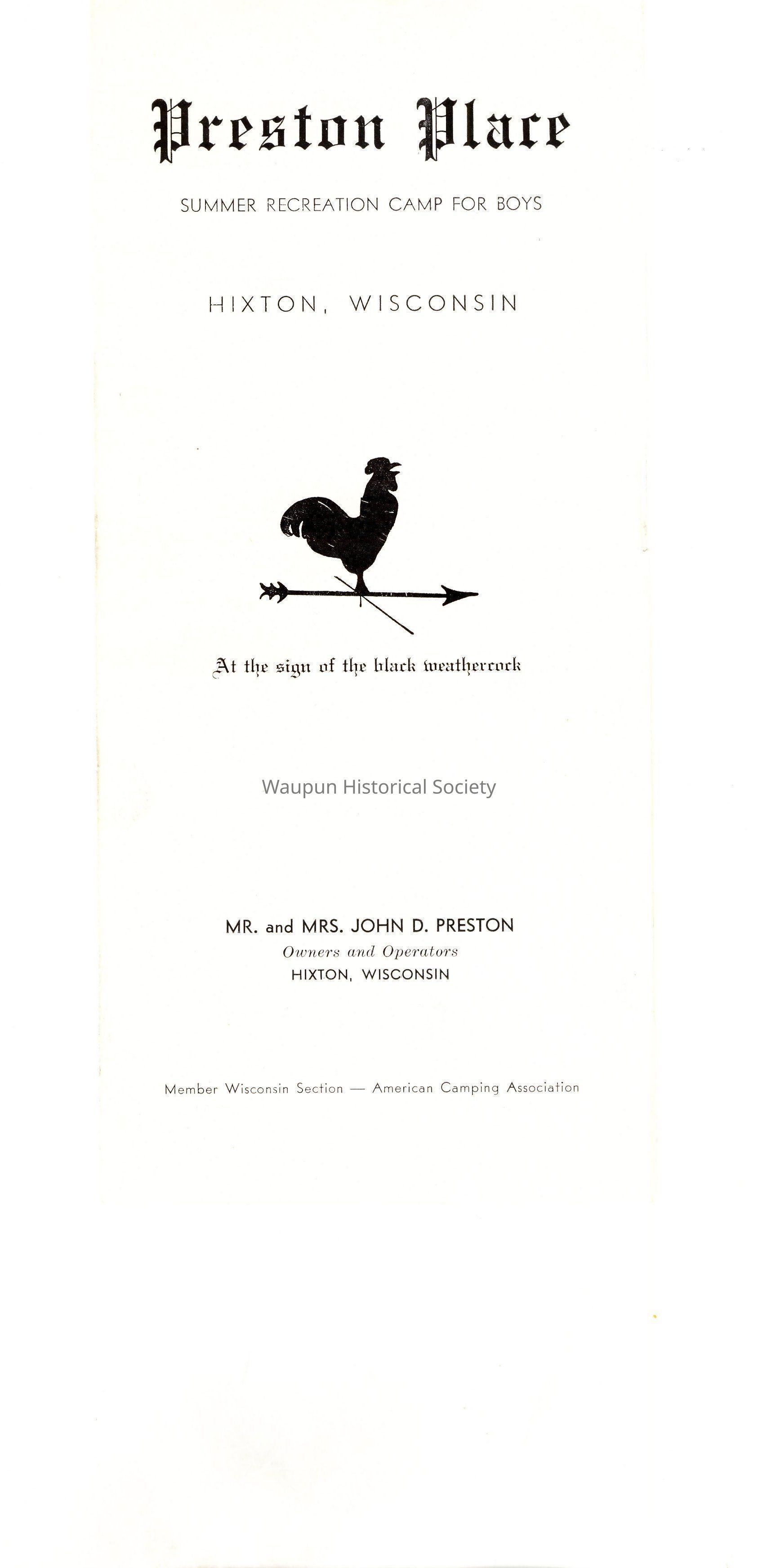 Pamphlet from Preston Place, Summer Recreation Camp for Boys, Hixton, Wisconsin - At the sign of the black westhercock
