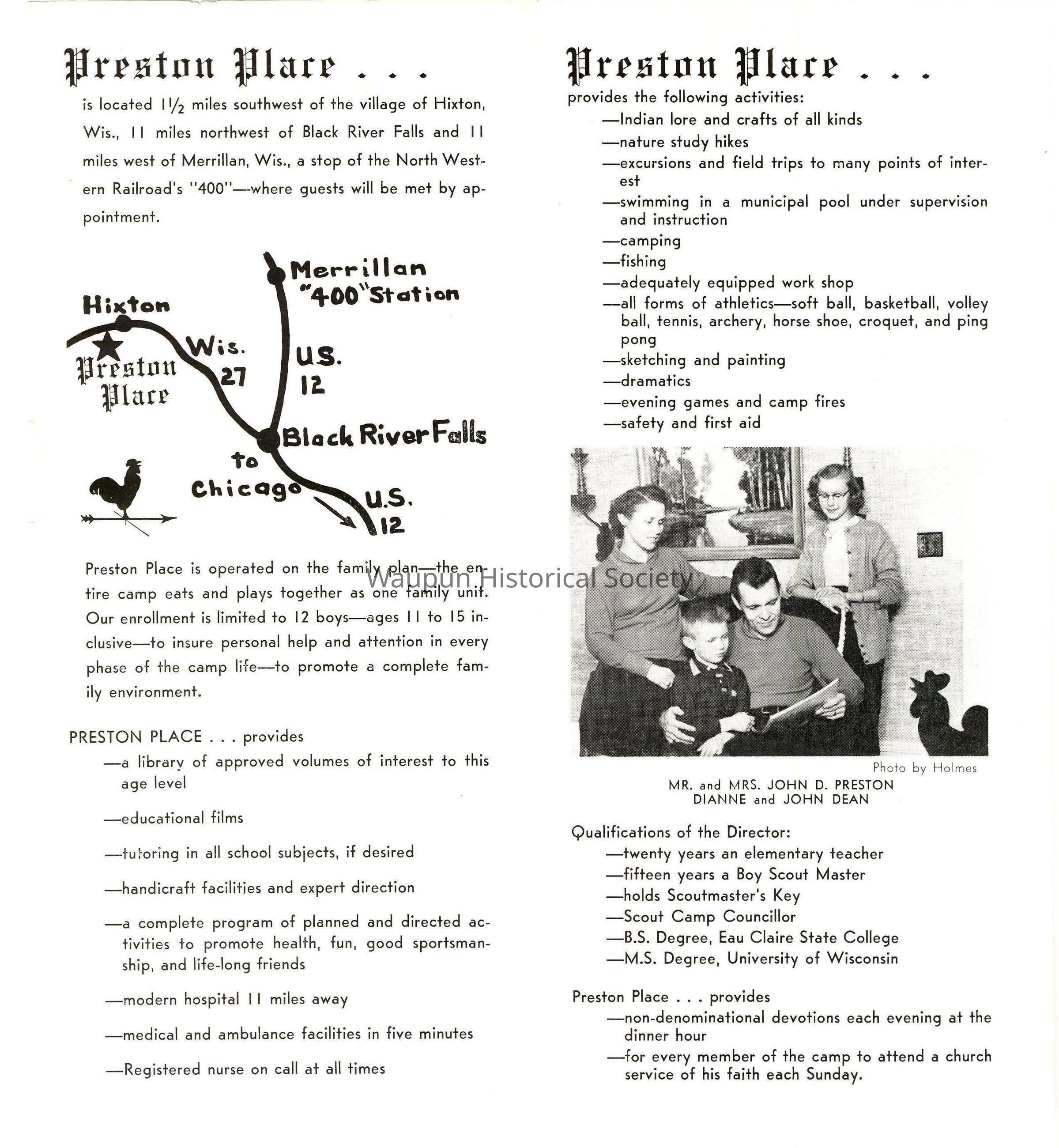 Preston Place is located 1 1/2 miles southwest of the village of Hixton, Wis., 11 miles northwest of Black River Falls and 11 miles west of Merrillan, Wis., a stop of the North Western Railroad's "400" - where guests will be met by appointment.