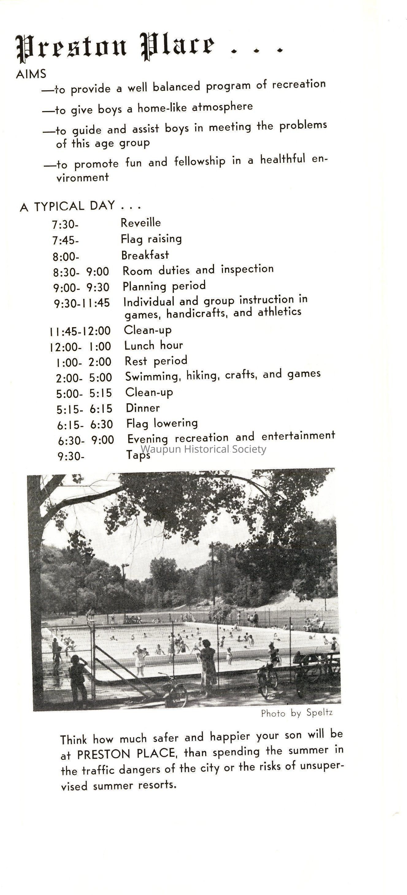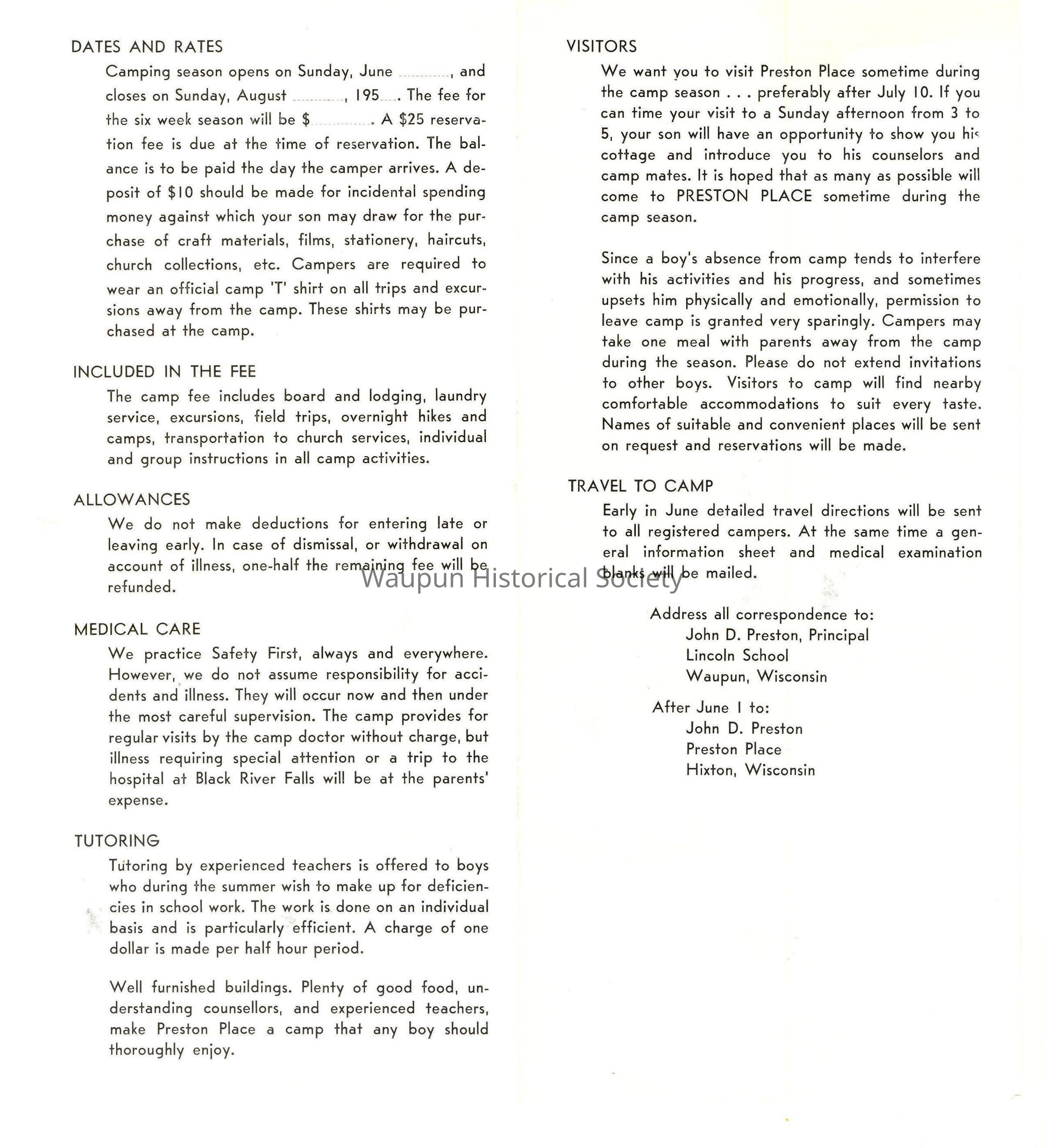 We want you to visit Preston Place sometime during the camp season . . .preferably after July 10. If you can time your visit to a Sunday afternoon from 3 to 5, your son will have an opportunity to show you his cottage an introduce you to his counselors and camp mates. It is hoped that as many as possible will come to PRESTON PLACE sometime during the camp season.