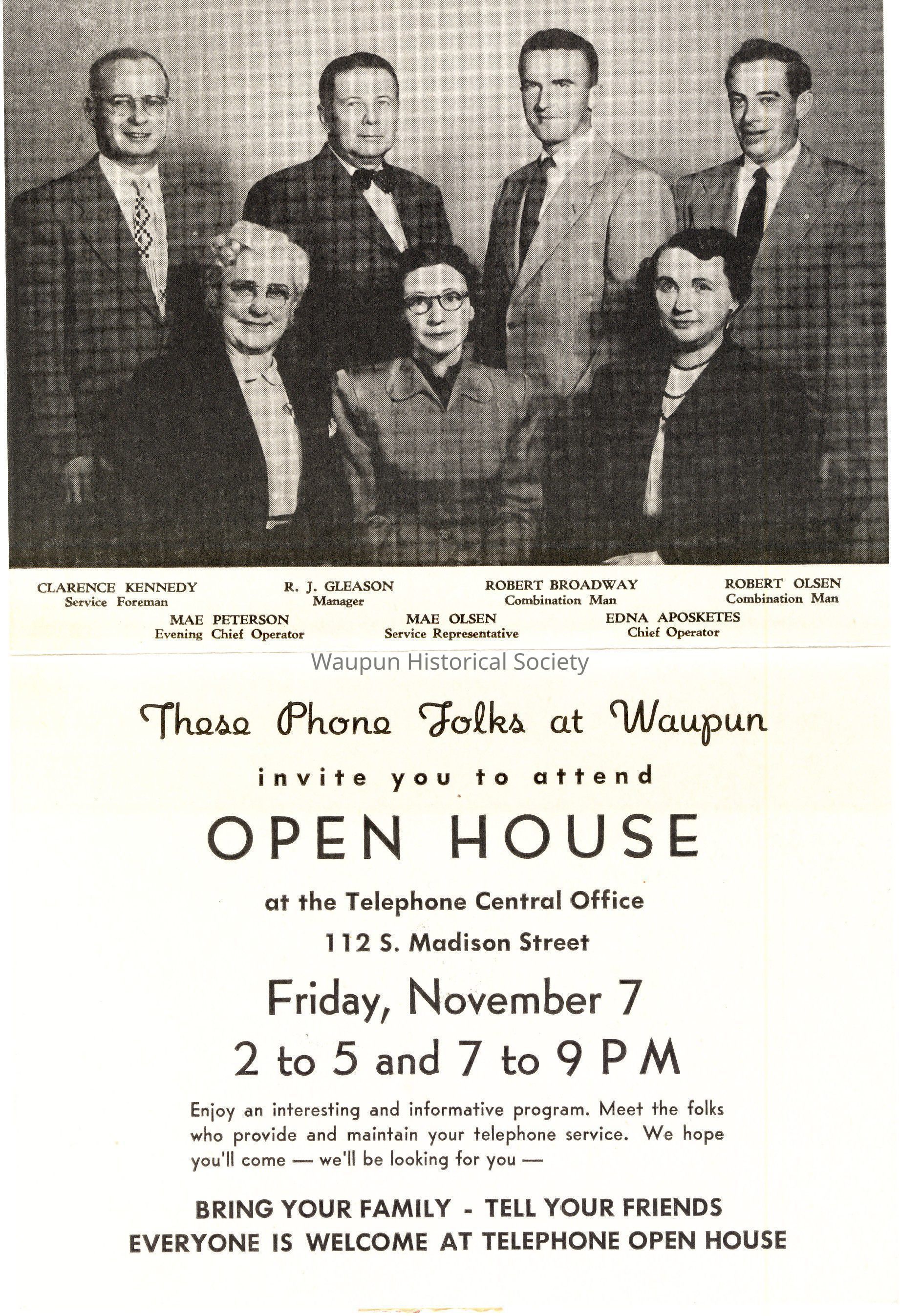 Clarence Kennedy, Service Foreman; R. J. Gleason, Manager; Robert Broadway, Combination Man; Robert Olsen, Combination Man; Mae Peterson, Evening Chief Operator; Mae Olsen, Service Representative; Edna Aposketes, Chief Operator - These Phone Folds at Waupun invite you to attend OPEN HOUSE at the Telephone Central Office, 112 S. Madison Street, Friday, November 7. 2 to 5 and 7 to 9 P M.