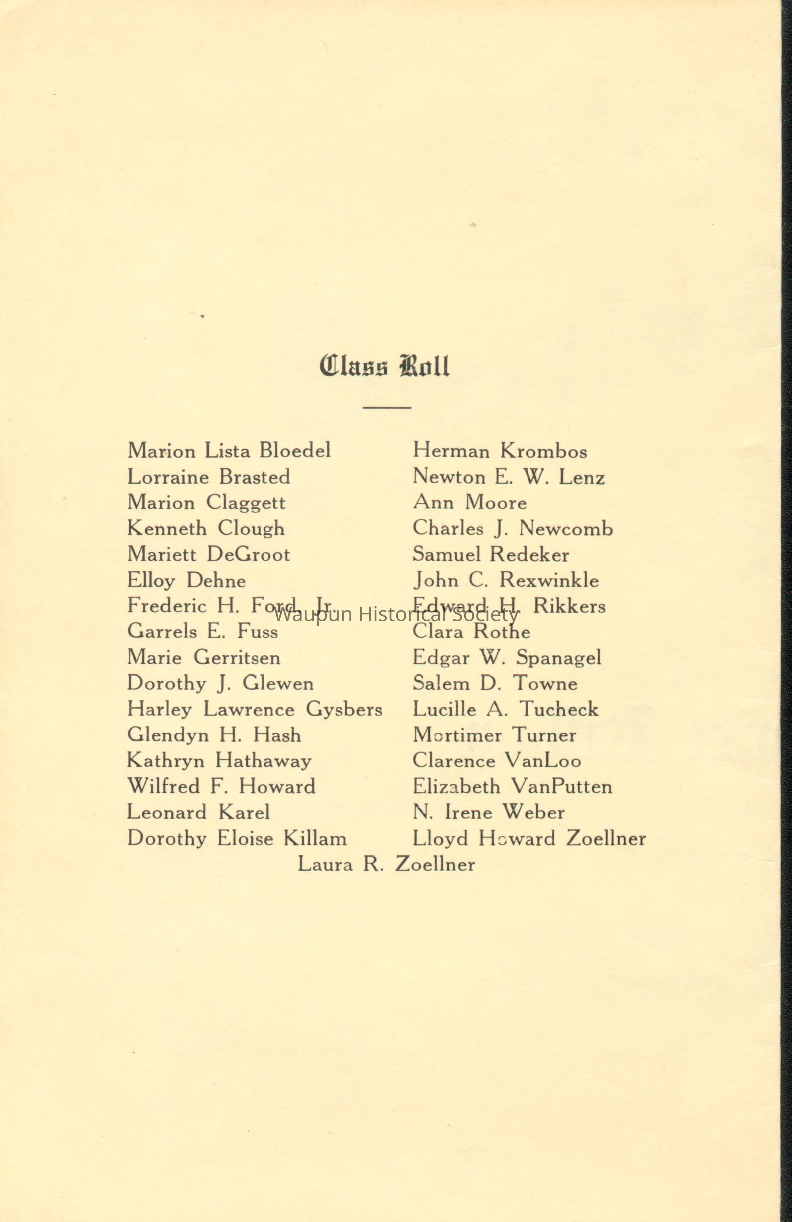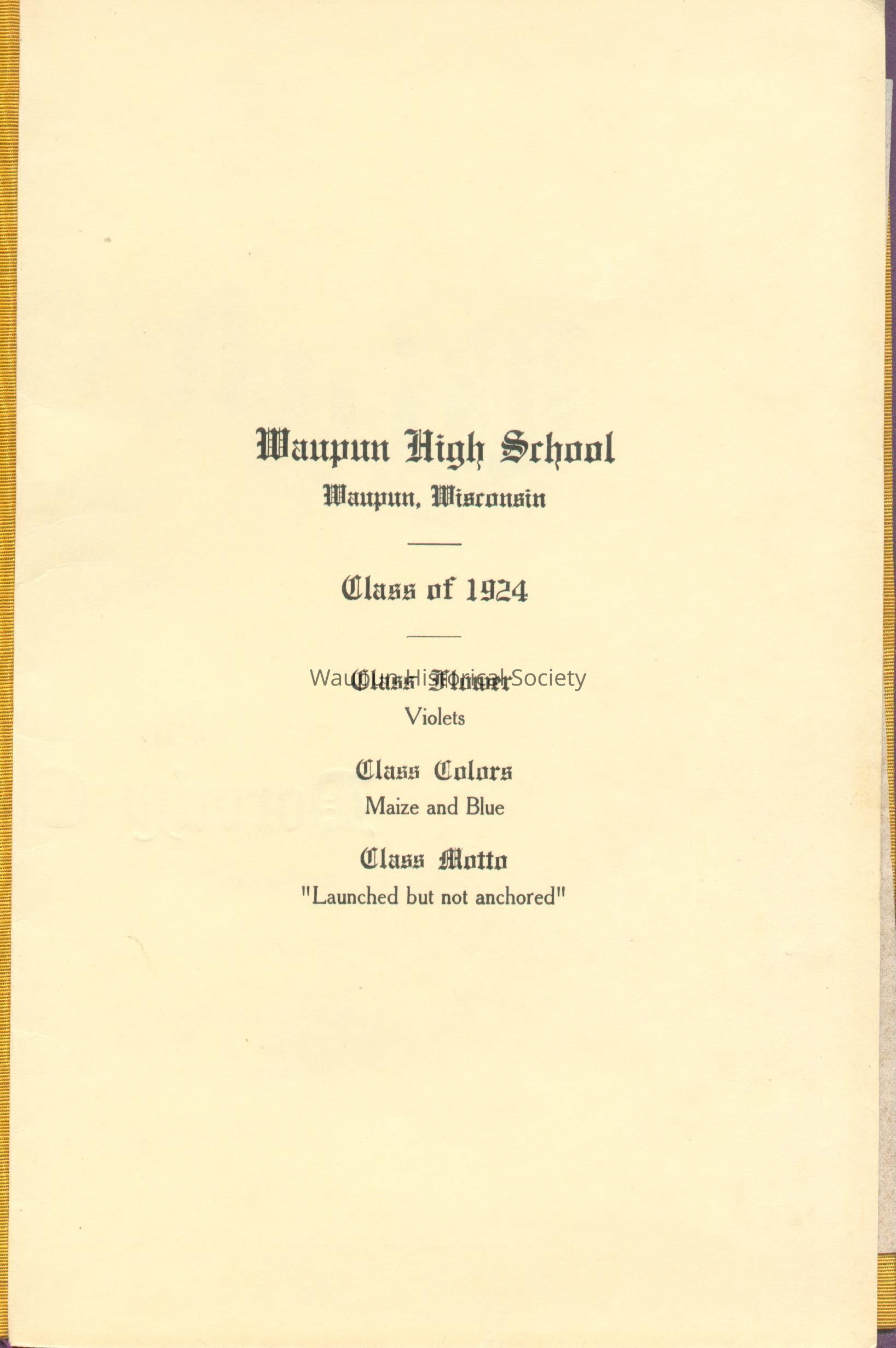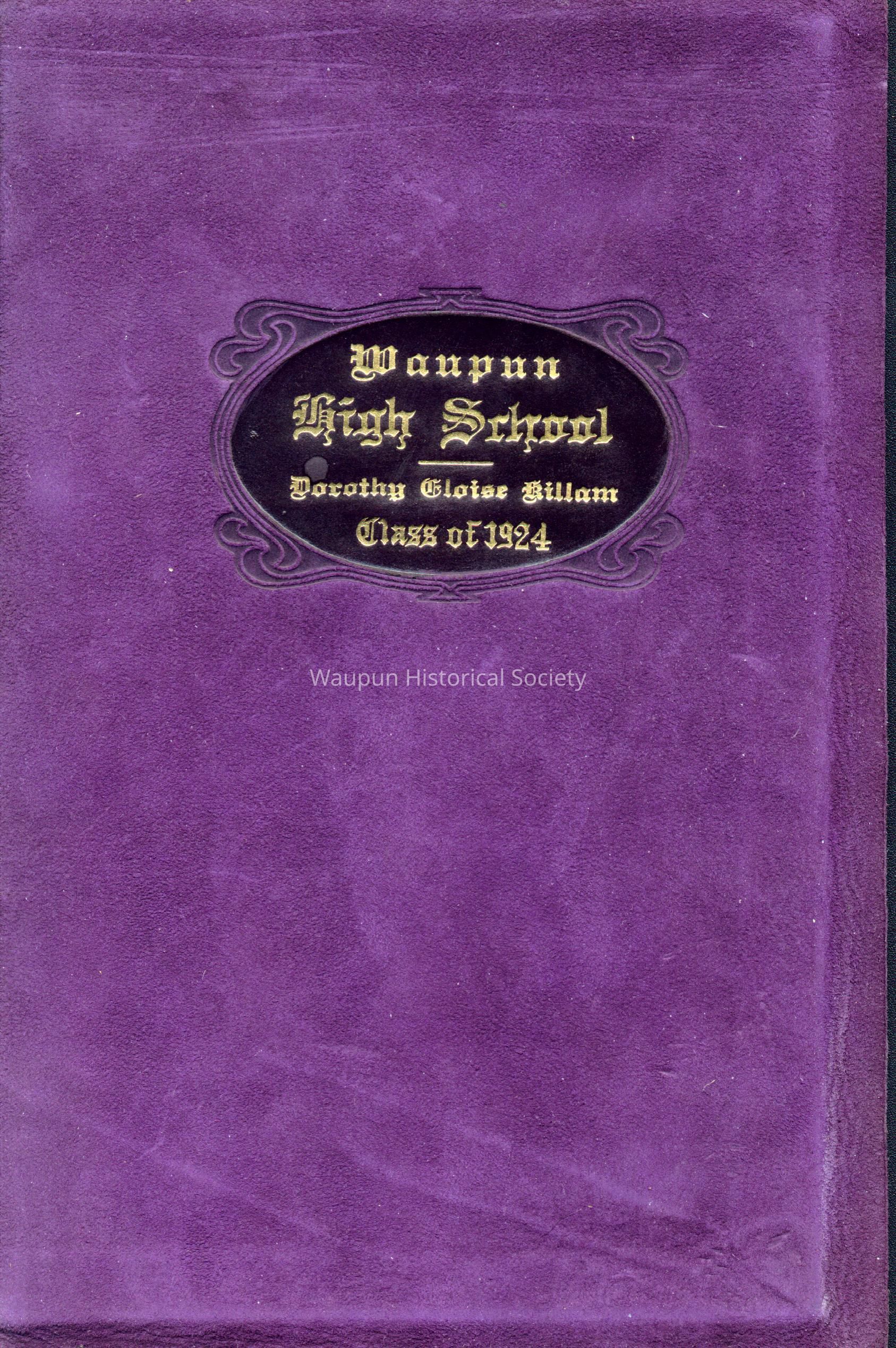 Waupun High School Diploma from 1924. This diploma was presented to Dorothy Eloise Killiam. She later married Edward G. Jewson. Her biography is included in the name search. The diploma is bound in a blue suede folder with gold embossing. A photo from the 1924 Waupun High School year book is also included. Caption with the photo indicates "Dorothy Killiam ("Tub") "Modest, quiet and sweet. Would there were more like her." Commercial Club 3-4."Acquisition