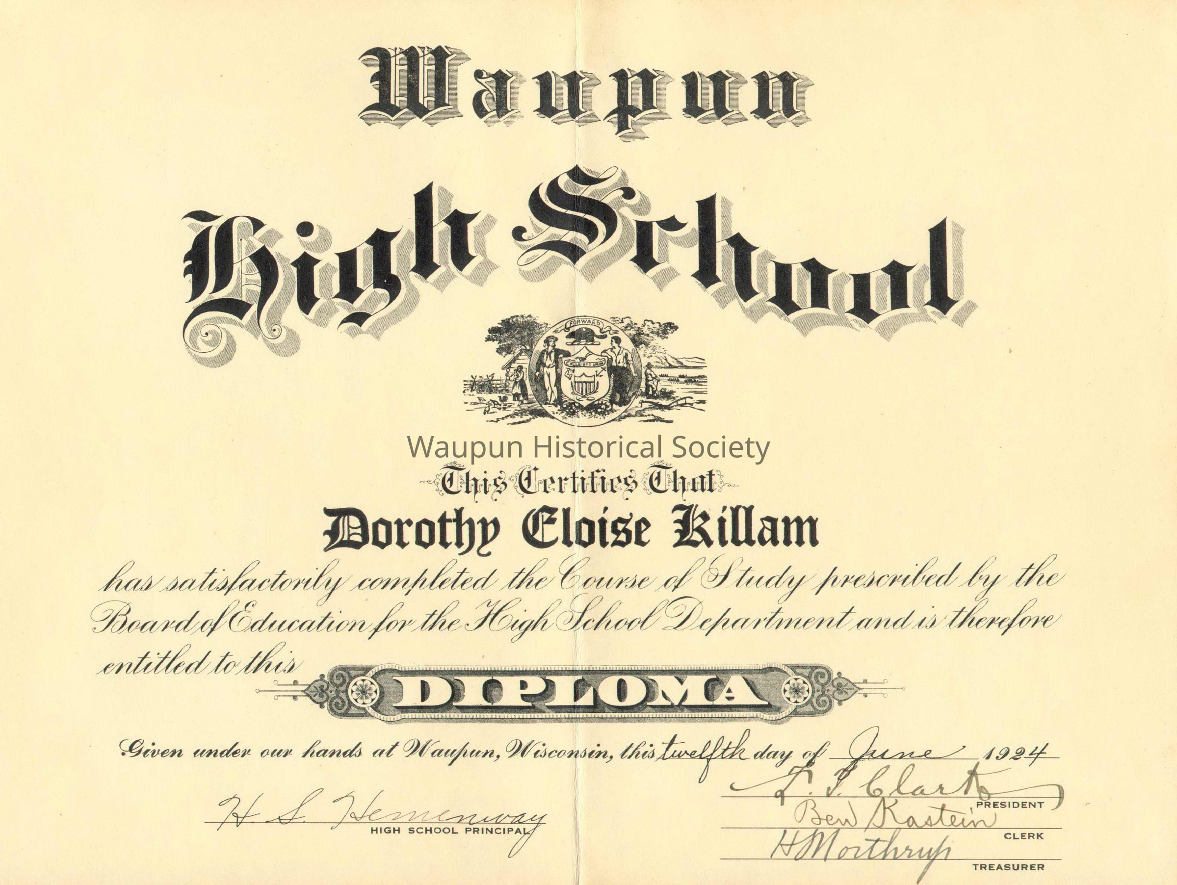 Diploma, Dorothy Eloise Killiam, WaupunEntry/Object ID
