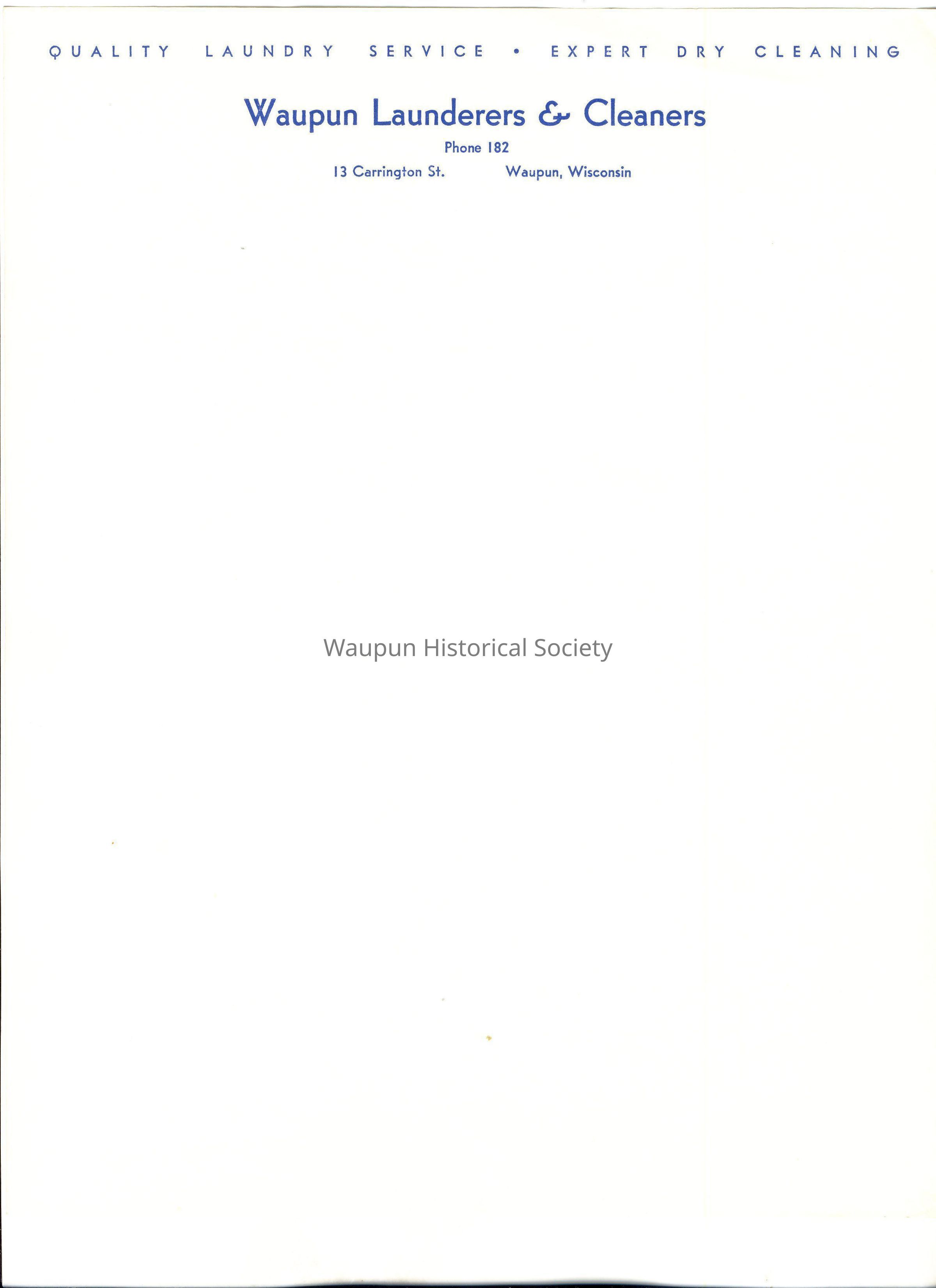 Letterhead paper for Waupun Launderers & Clearners - Phone 182, 13 Carrington St., Waupun, Wisconsin,