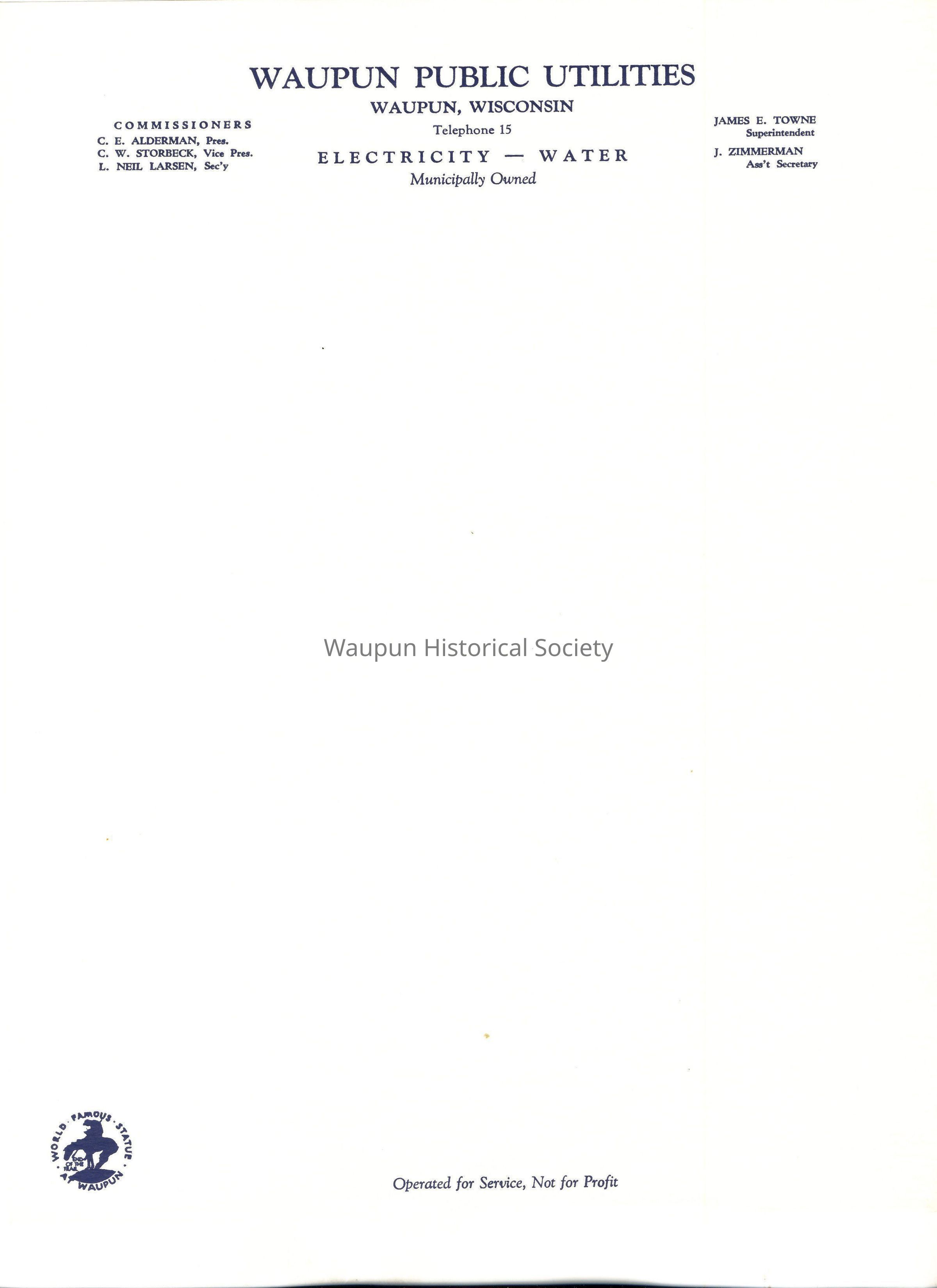 Letterhead, Utilities, Electric-Water, Municipally Owned. Letterhead for WAUPUN PUBLIC UTILITES, Waupun, Wisconsin, Telephone 15 - ELECTRICITY-WATER - Municipally Owned
