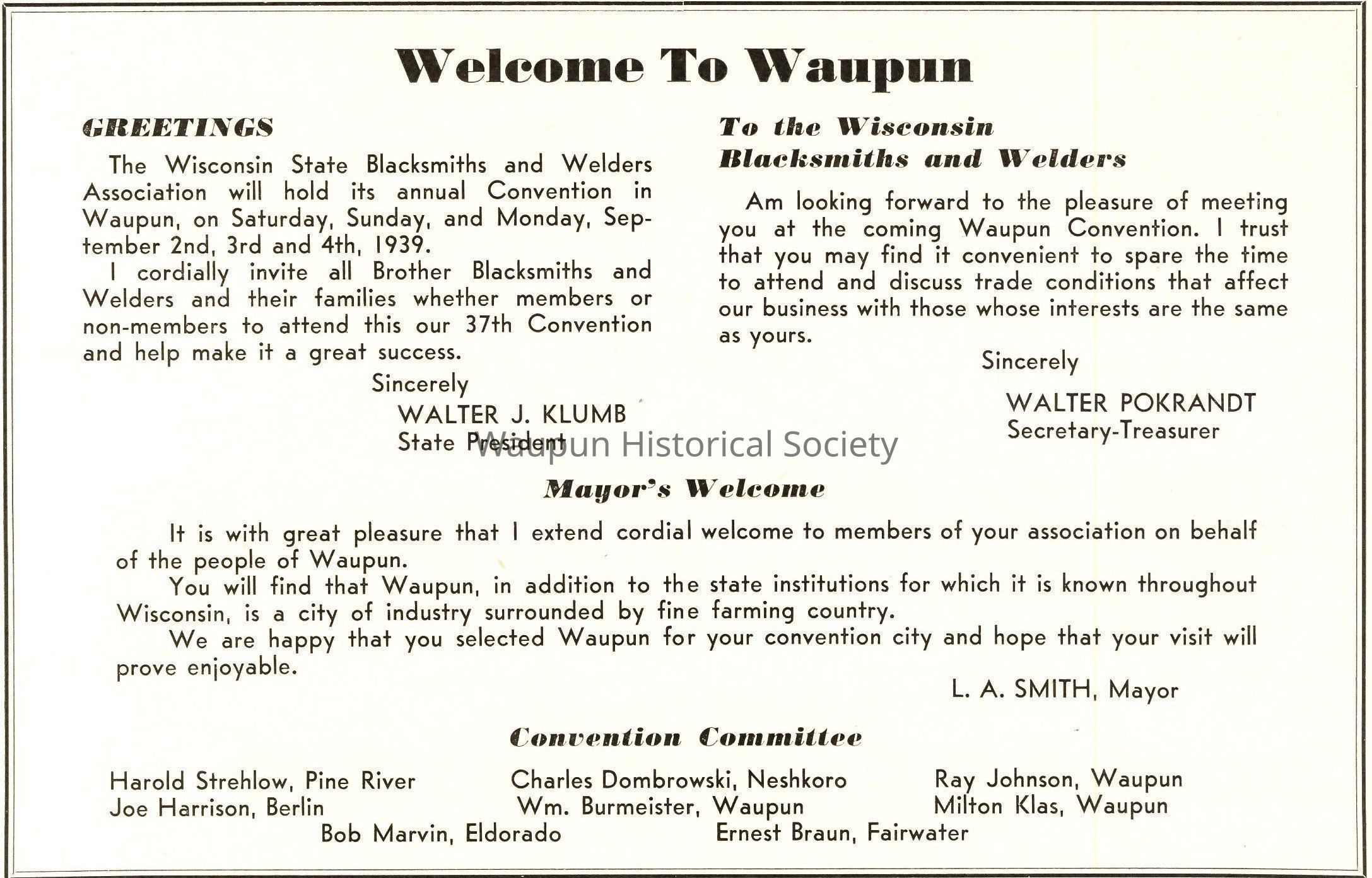 Mayor's Welcome from L. A. Smith, Mayor of Waupun - 1939