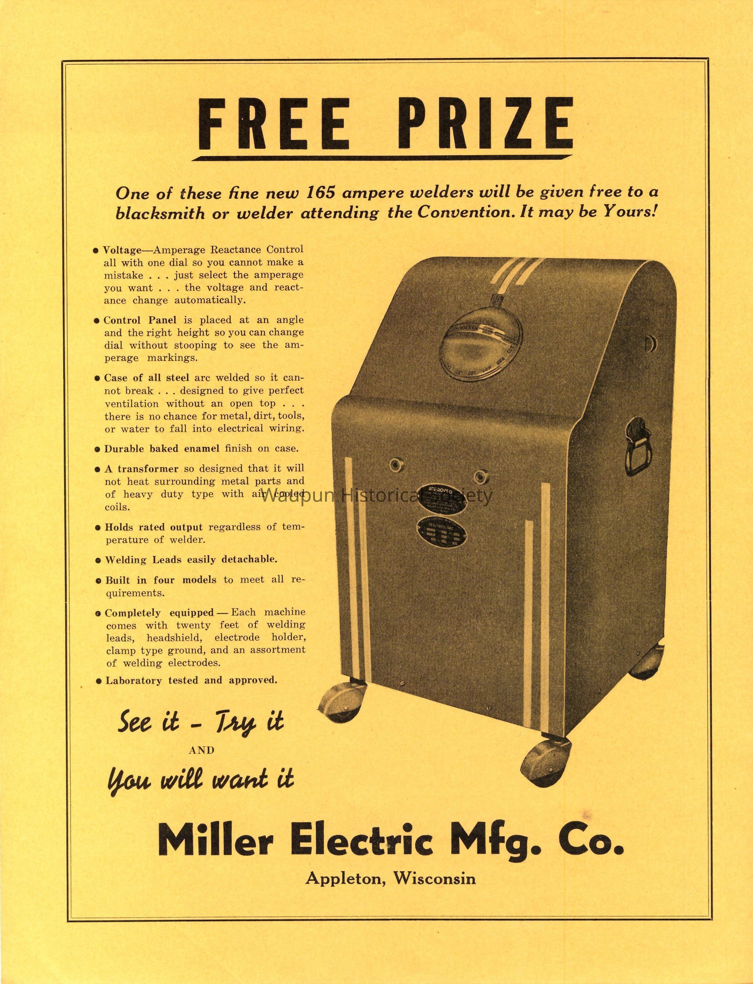 FREE PRIZE - a new 165 ampere welder from Miller Electric Mfg. Co., Appleton, WisconsinAcquisition