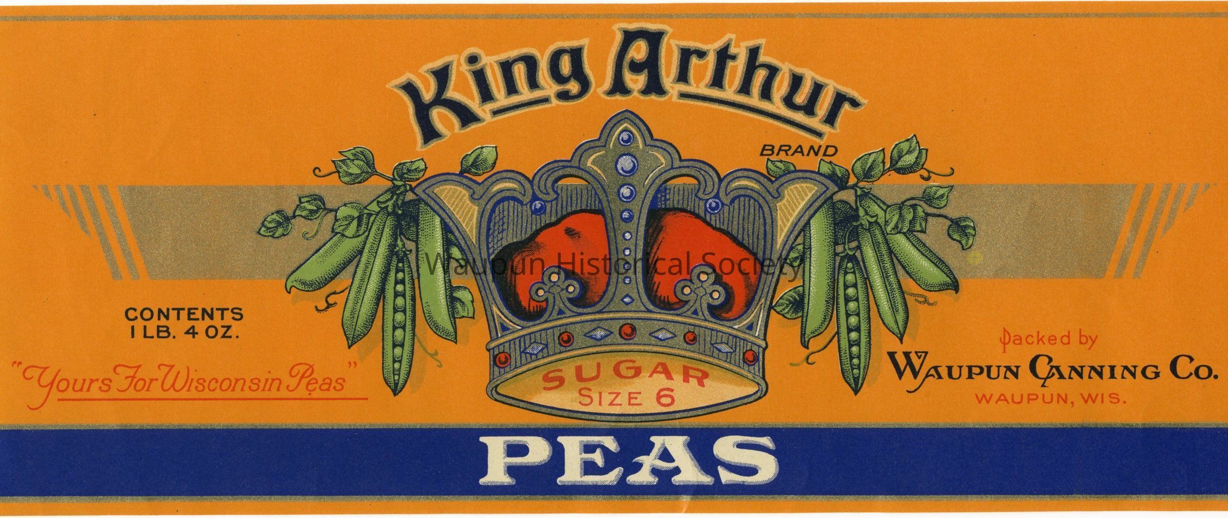 8 King Arthur Pea Can labels, size 6, sugar (Unused). These labels were used by the Waupun Canning Co., which was located in the old mill right next to the mill pond. The factory became a foundry and was eventually torn down. The area was made into the Harris Mill Park and the mill pond was offically renamed Harris Mill Pond.Acquisition
