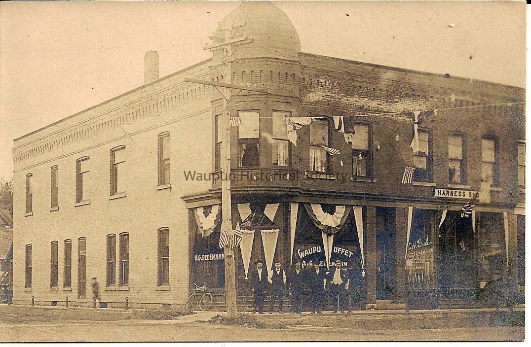 Postcard, showing the Waupun Buffet. This building is on the Southwest corner of Main and Carrington Streets. The child and the men are not identified. Notice the Harness Shop to the West of the building. It appears that A. G. Redemann operated the Buffet, café or restaurant.Acquisition
