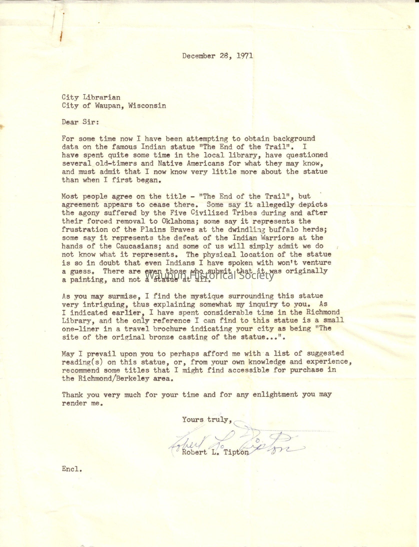For some time now I have been attempting to obtain background data on the famous Indian statue "The End of the Trail", I have spent quite some time in the local library, have questioned several old-timers and Native Americans for what they may know, and must admit that I now know very little more about the statue than when I first began.