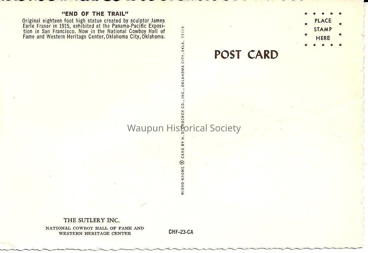 On the back of the postcard is written: "End of th Trail, Original eighteen foot high statue created by sculptor James Earle Fraser in 1915, exhibited at the Panama-Pacific Exposition in San Francisco. Now in the National Cowboy Hall of Fame and Western Heritage Center, Oklahoma City, Oklahoma. The Sutlery Inc. National Cowboy Hall of Fame and Western Heritage Center."Acquisition