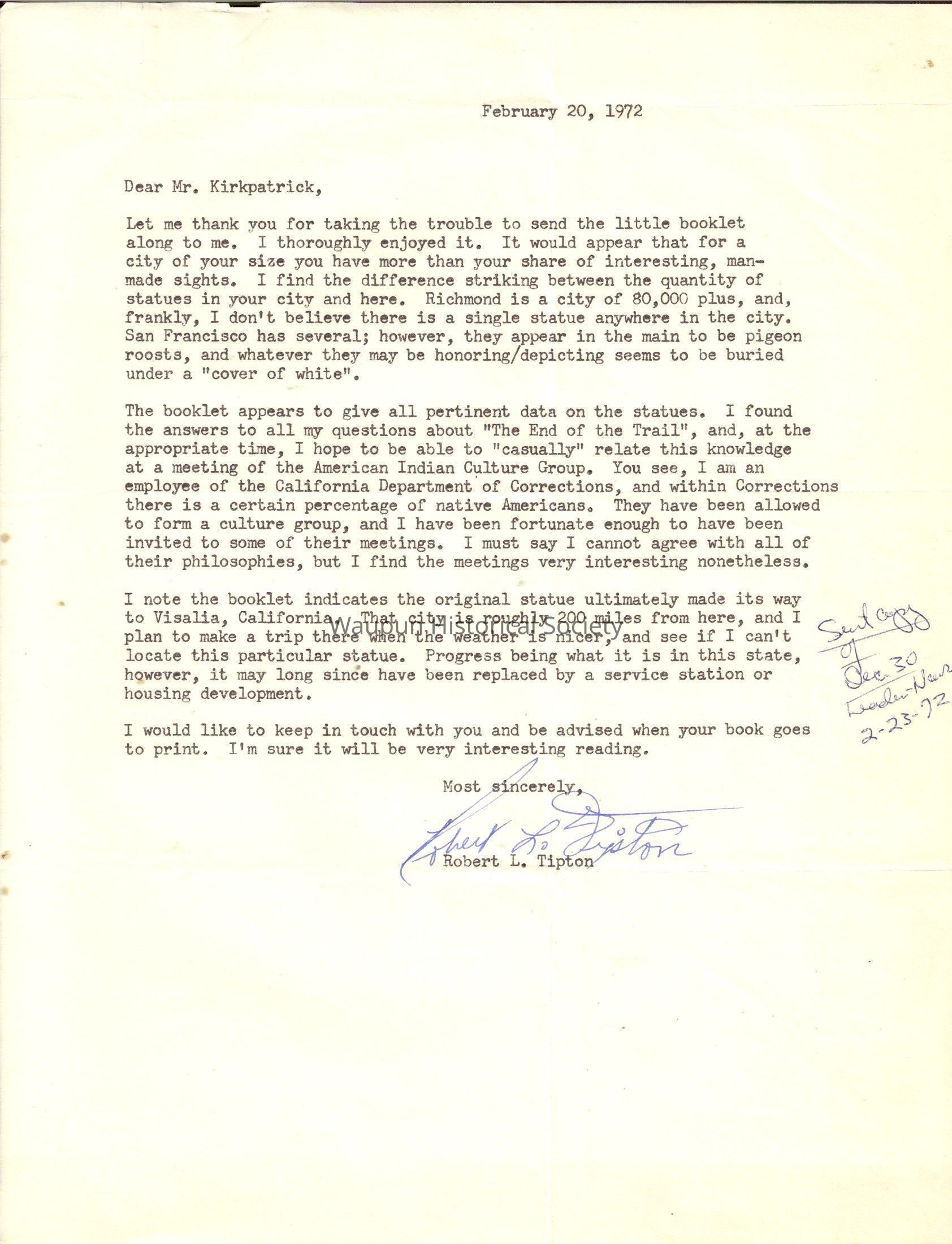 The booklet appears to give all pertinent data on the statues. I found the answers to all my questions about "The End of the Trail", and, at the appropriate time, I hope to be able to "casually" relate this knowledge at a meeting of the American Indian Culture Group, You see, I am an employee of the California Department of Corrections, and within Corrections there is a certain percentage of native Americans. They have been allowed to form a culture group, and I have been fortunate enough to have been invited to some of their meetings. I must say I cannot agree with all of their philosophies, but I find the meetings very interesting nonetheless, I note the booklet indicates the original statue ultimately made its way to Visalia, California. That city is roughly 200 miles from here, and I plan to make a trip there when the weather is nicer, and see if I can't I locate this particular statue. Progress being what it is in this state, however, it may long since have been replaced by a service station or housing development.