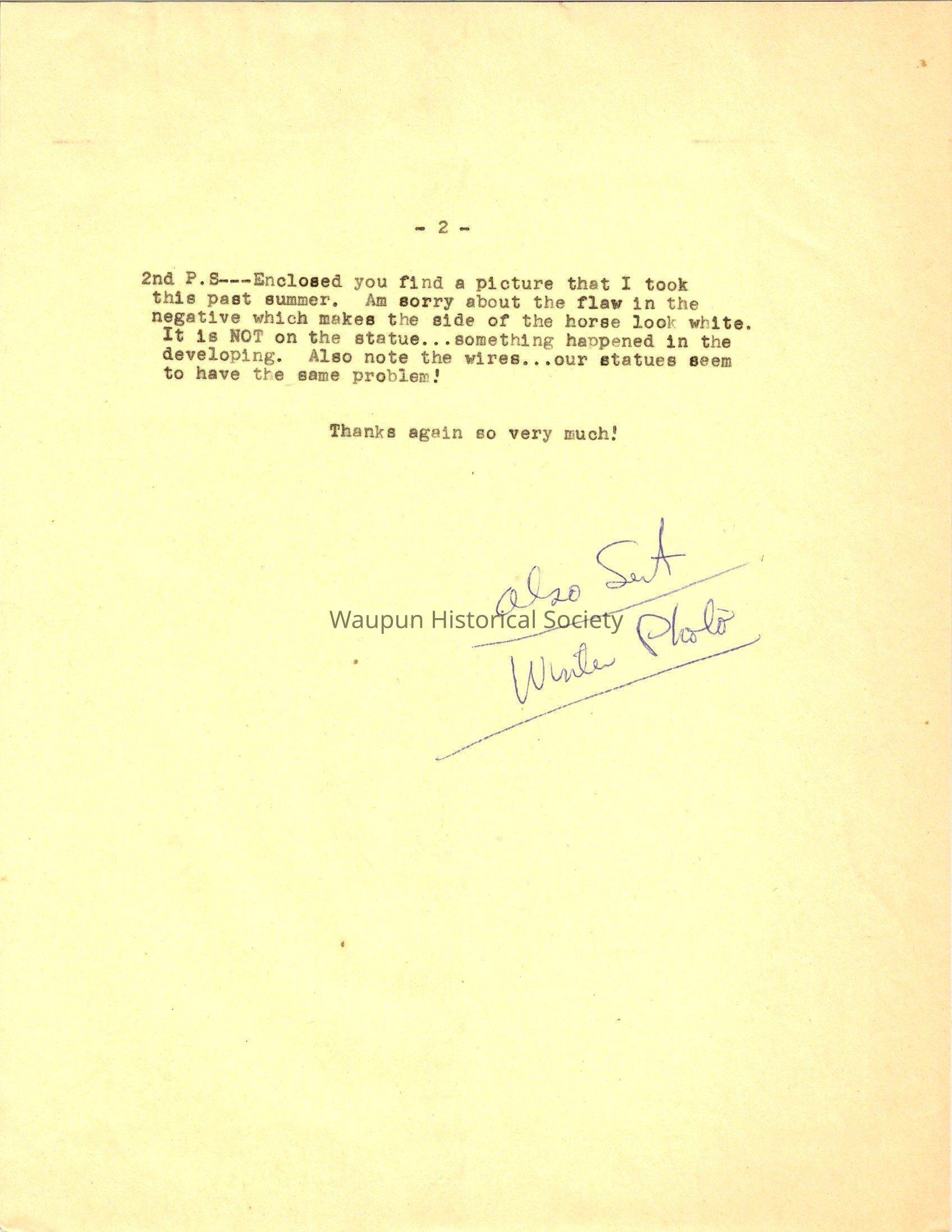 2nd P .S---Enclosed you find a picture that I took this past summer. Am sorry about the flaw in the negative which makes the side of the horse look white It is NOT on the statue...something happened in the developing. Also note the wires...our statues seem to have the same problem!