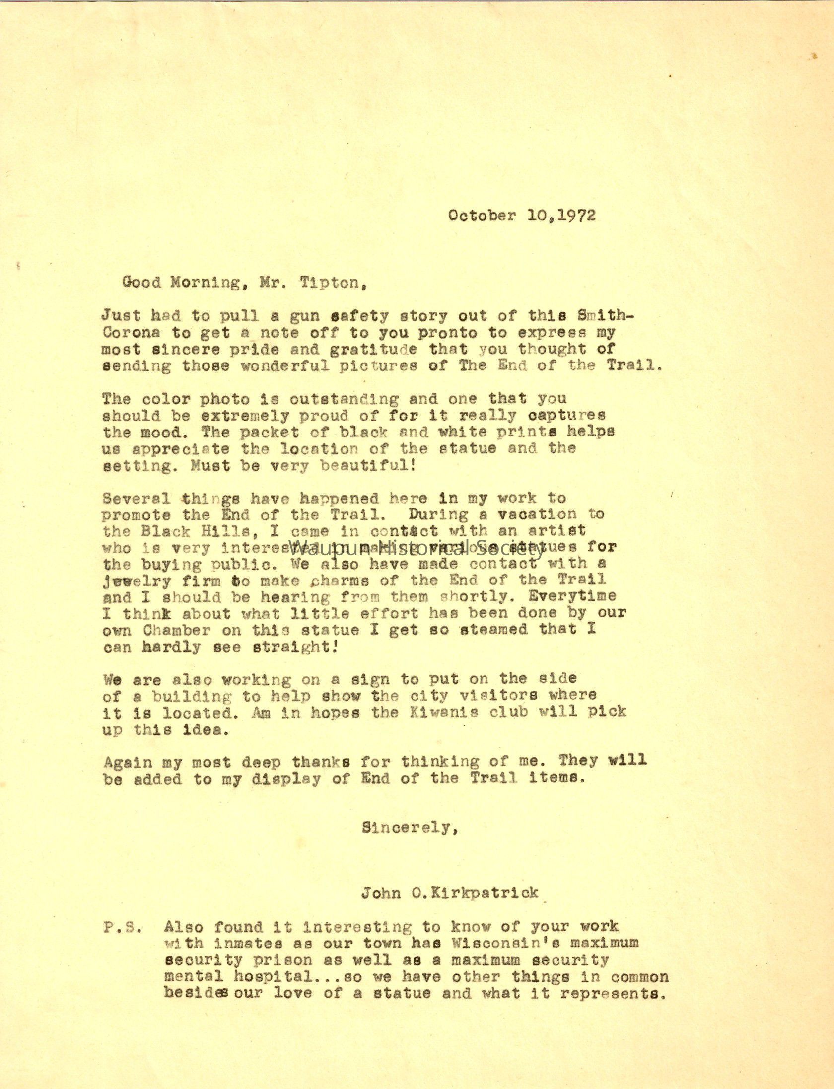 Several things have happened here in my work to Promote the End of the Trail. During a vacation to the Black Hills, I came in contact with an artist who Is very Interested in making various statues for the buying public. We also have made contact with a jewelry firm to make charms of the End of the Trail and I should be hearing from them shortly. Every time