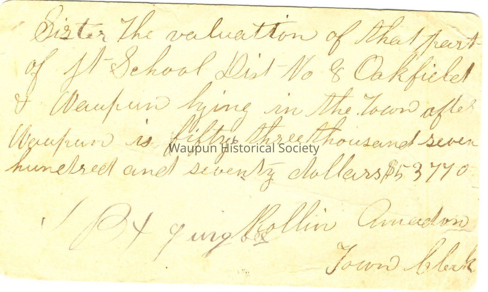 Sister The valuation of that part of jt School Dist-No 8 Oakfield & Waupun lying in the Town after Waupun is fifty three thousand seven hundred and seventy dollars -$53770.