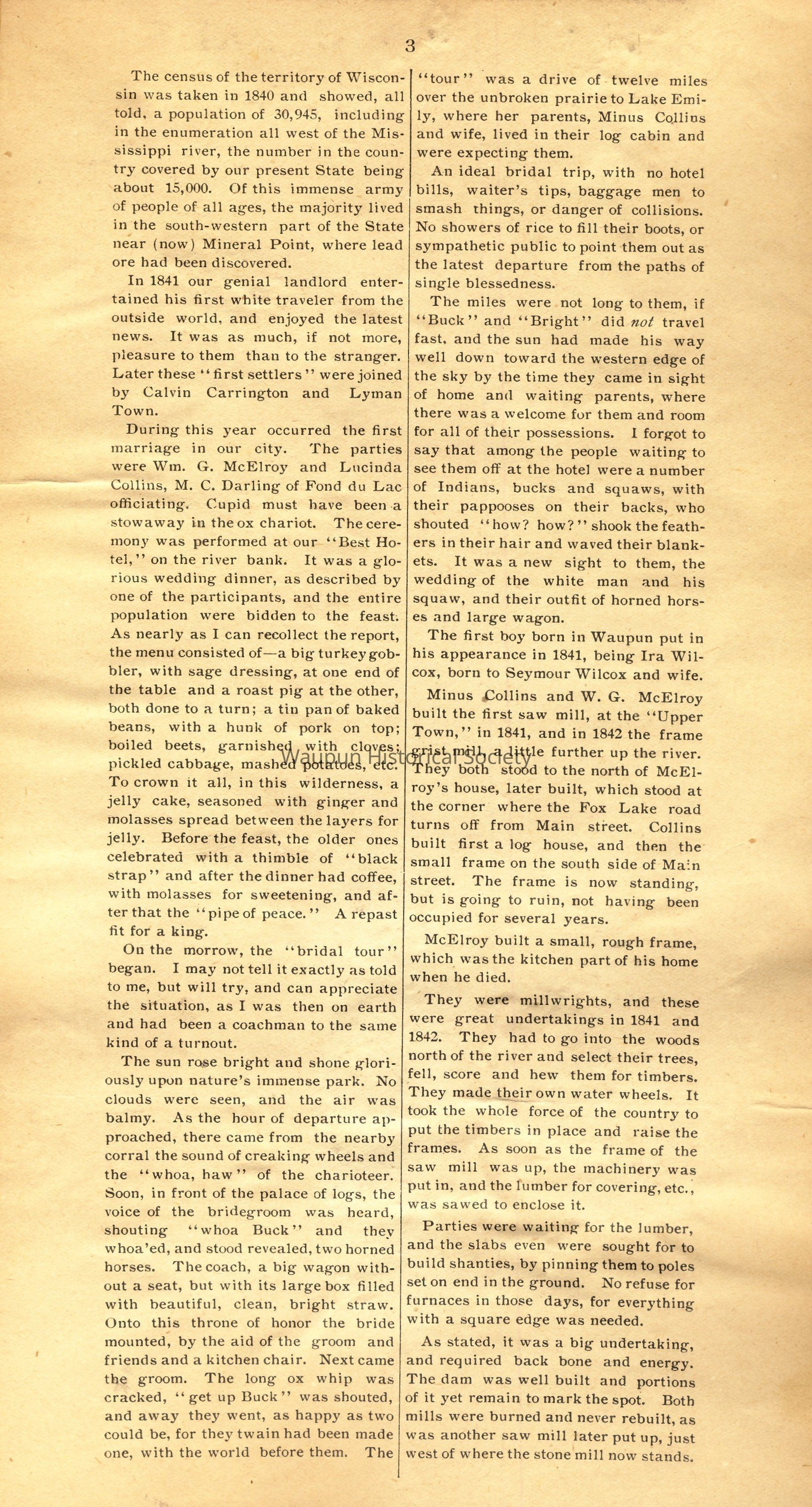 During this year occurred the first marriage in our city. The parties were Wm. G. McElroy and Lucinda Collins, M. C. Darling of Fond du Lac officiating. Cupid must have been a stowaway in the ox chariot. The ceremony was performed at our "Best Hotel," on the river bank. It was a glorious wedding dinner, as described by one of the participants, and the entire population were bidden to the feast. As nearly as I can recollect the report, the menu consisted of - a big turkey gobbler, with sage dressing, at one end of the table and a roast pig at the other, both done to a turn; a tin pan of baked beans, with a hunk of pork on top; boiled beets, garnished with cloves; pickled cabbage, mashed potatoes, etc. To crown it all, in this wilderness, a jelly cake, seasoned with ginger and molasses spread between the layers for jelly. Before the feast, the older ones celebrated with a thimble of "black strap" and after the dinner had coffee, with molasses for sweetening, and after that the "pipe of peace." A repast fit for a king.