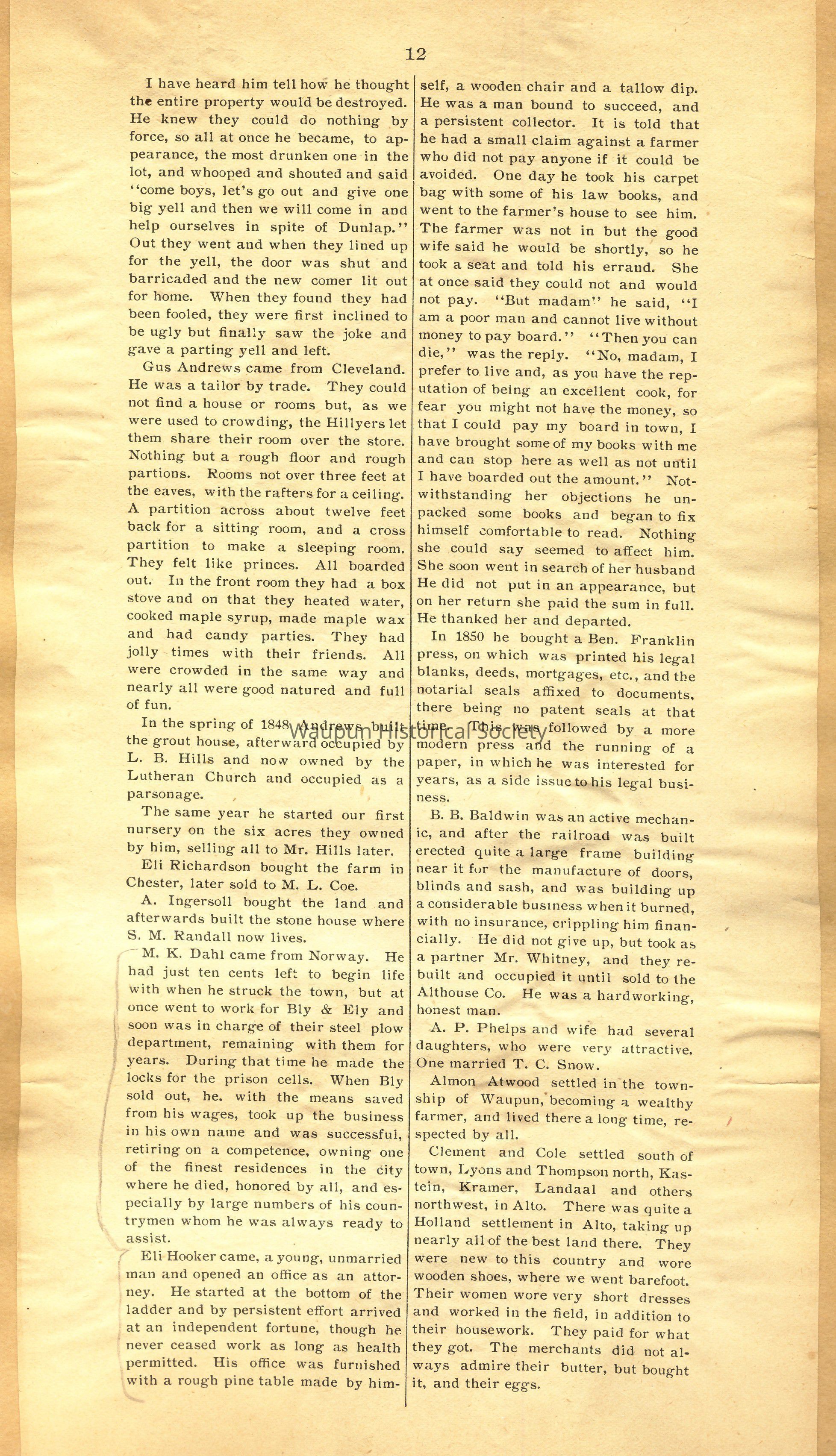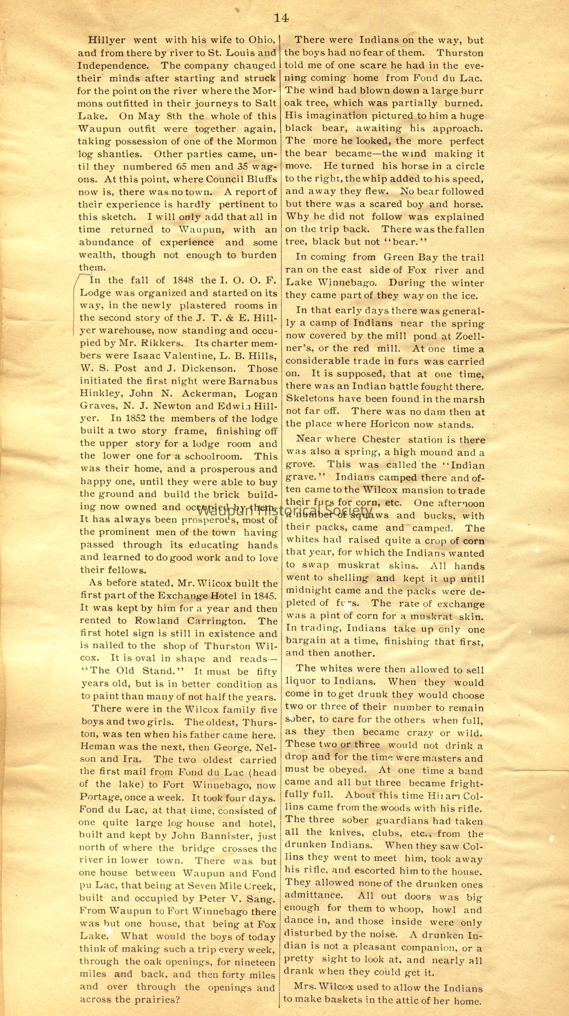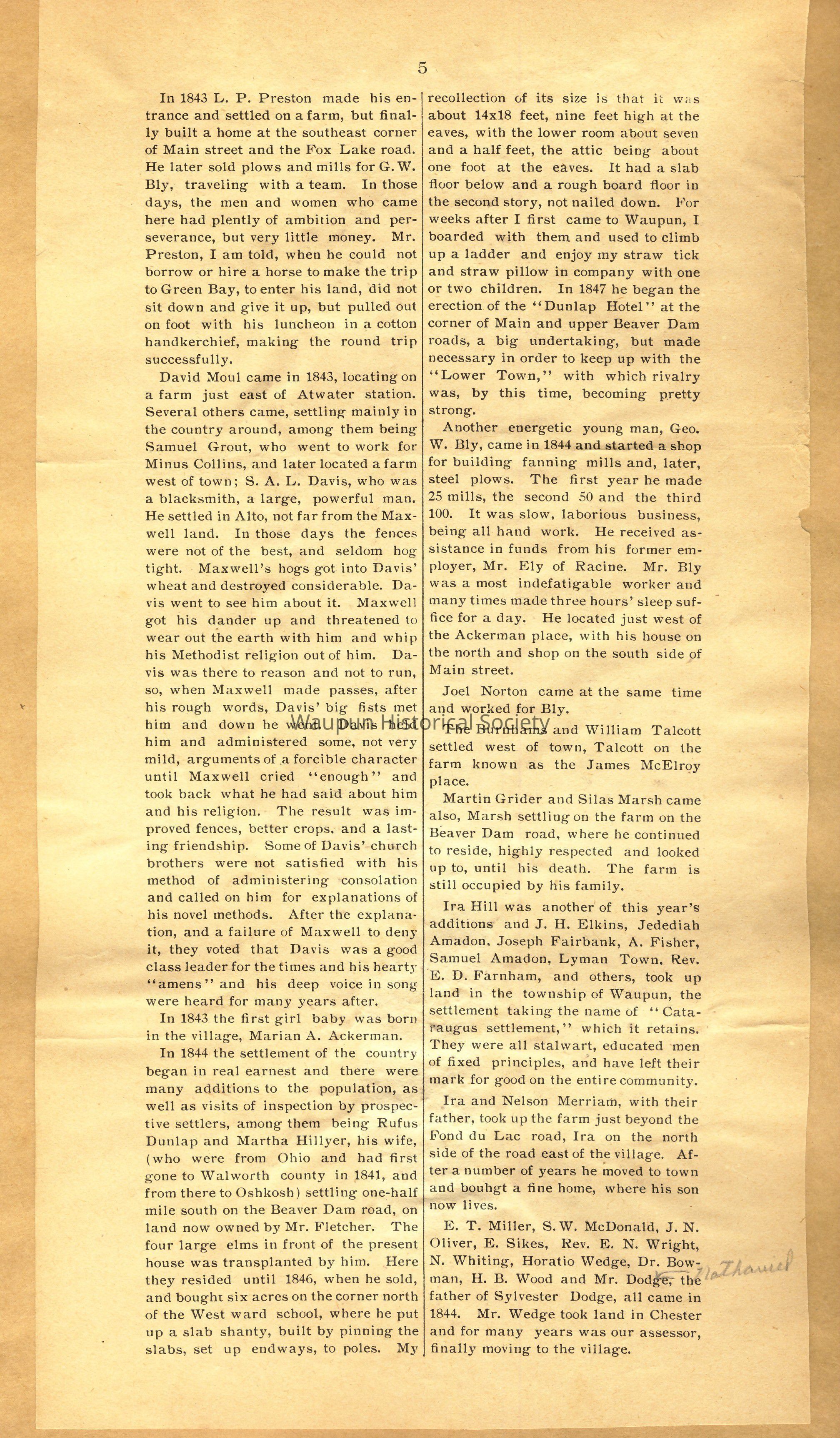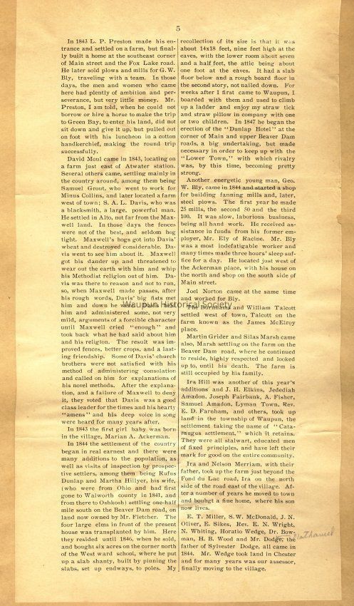 In 1843 L. P. Preston made his entrance and settled on a farm, but finally built a home at the southeast corner of Main street and the Fox Lake road. He later sold plows and mills for G.W. Bly, traveling with a team. In those days, the men and women who came here had plently of ambition and perseverance, but very little money. Mr. Preston, I am told, when he could not borrow or hire a horse to make the trip to Green Bay, to enter his land, did not sit down and give it up, but pulled out on foot with his luncheon in a cotton handkerchief, making the round trip successfully.