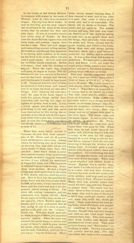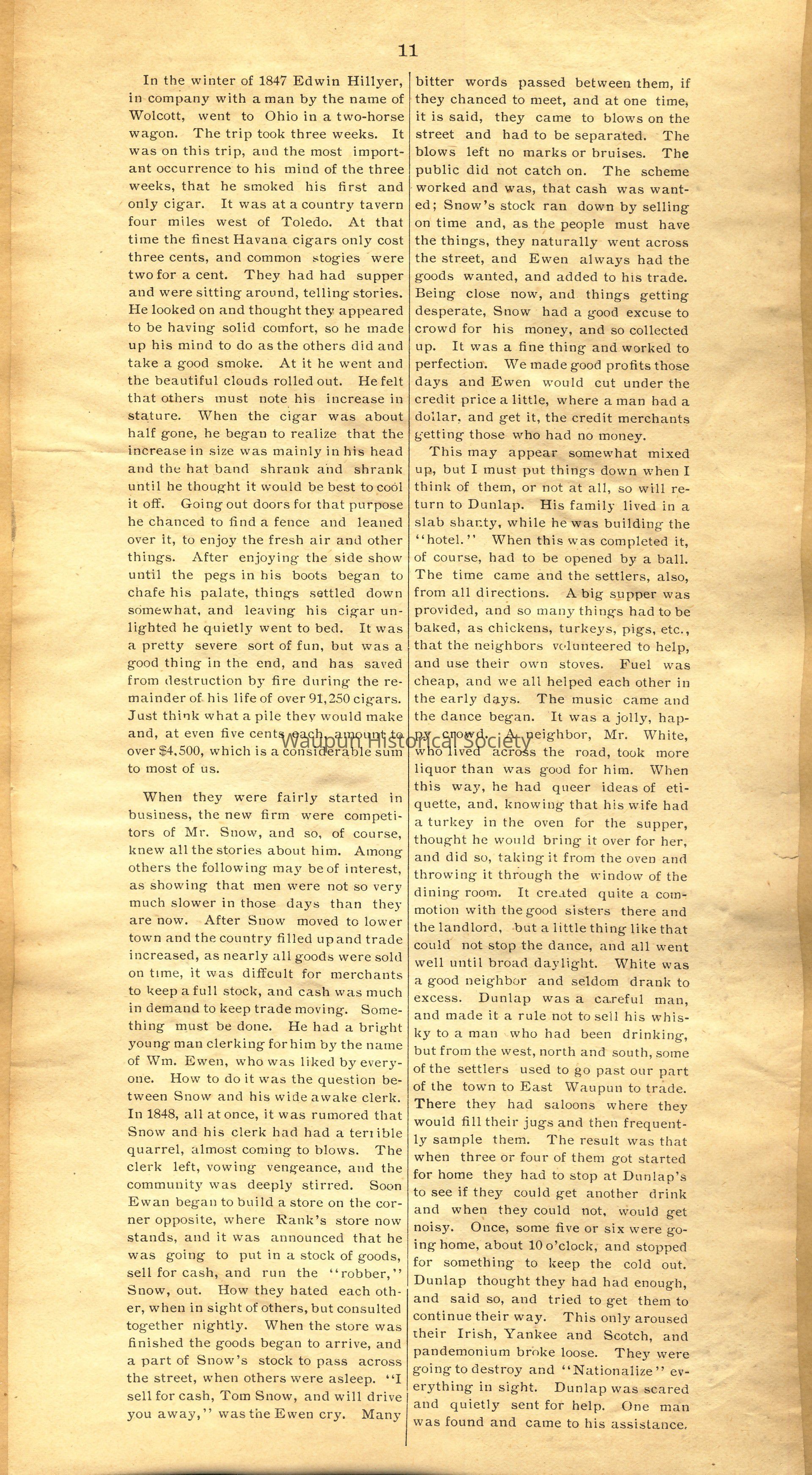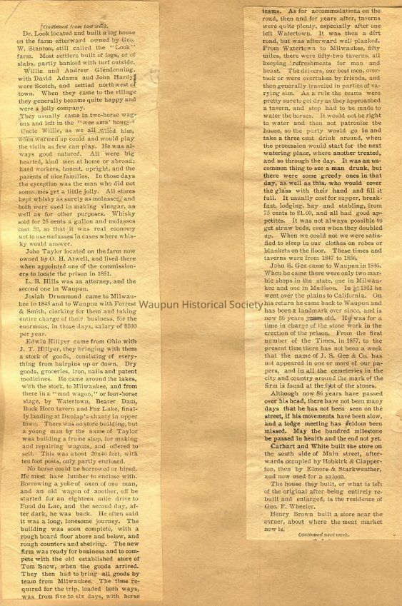 In 1844 the settlement of the country began in real earnest and there were many additions to the population, as well as visits of inspection by prospective settlers, among them being Rufus Dunlap and Martha Hillyer, his wife, (who were from Ohio and had first gone to Walworth county in 1841, and from there to Oshkosh) settling one-half mile south on the Beaver Dam road, on land now owned by Mr. Fletcher. The four large elms in front of the present house was transplanted by him. Here they resided until 1846, when he sold, and bought six acres on the corner north of the West ward school, where he put up a slab shanty, built by pinning the slabs, set up endways, to poles. My recollection of its size is that it was about 14x18 feet, nine feet high at the eaves, with the lower room about seven and a half feet, the attic being about one foot at the eaves. It had a slab floor below and a rough board floor in the second story, not nailed down. For weeks after I first came to Waupun, I boarded with them and used to climb up a ladder and enjoy my straw tick and straw pillow in company with one or two children. In 1847 he began the erection of the "Dunlap Hotel" at the corner of Main and upper Beaver Dam roads, a big undertaking, but made necessary in order to keep up with the "Lower Town," with which rivalry was, by this time, becoming pretty strong.