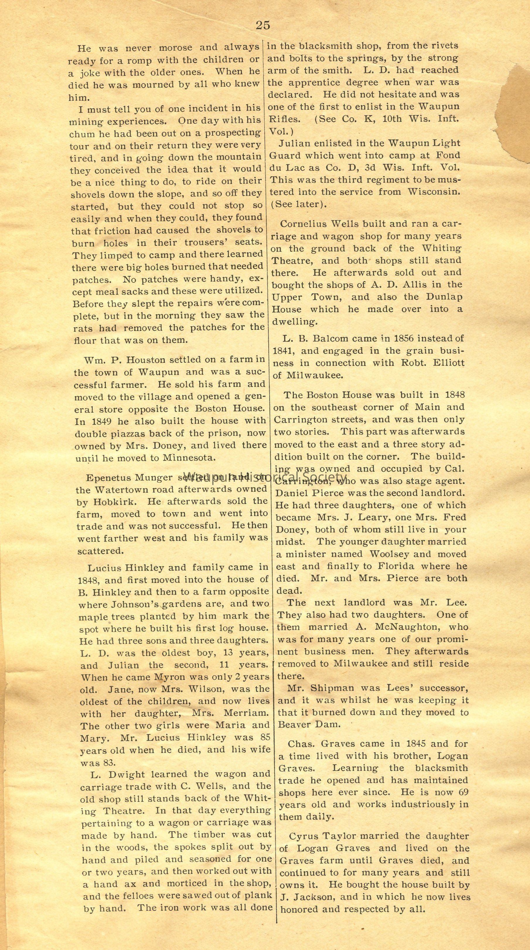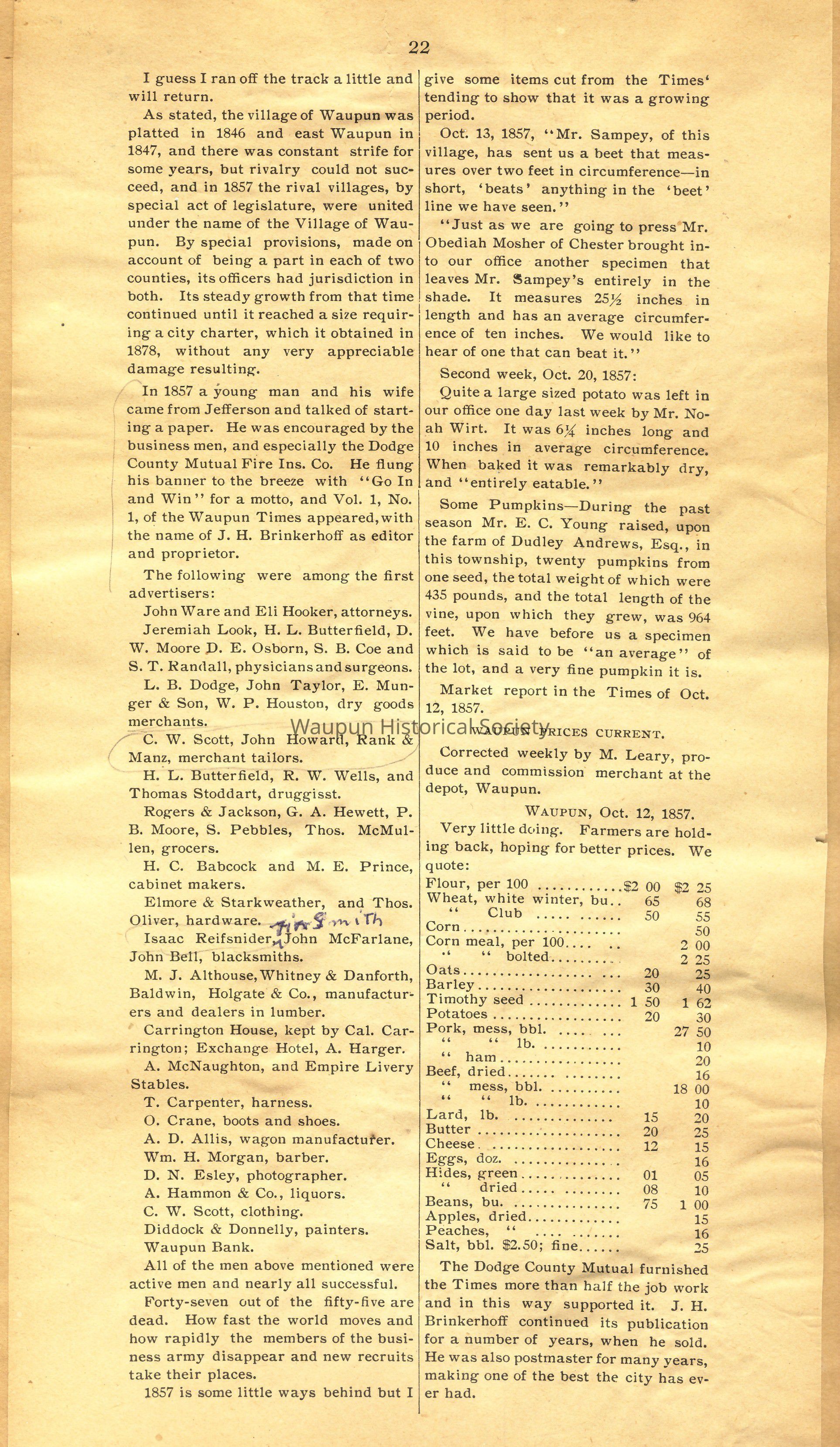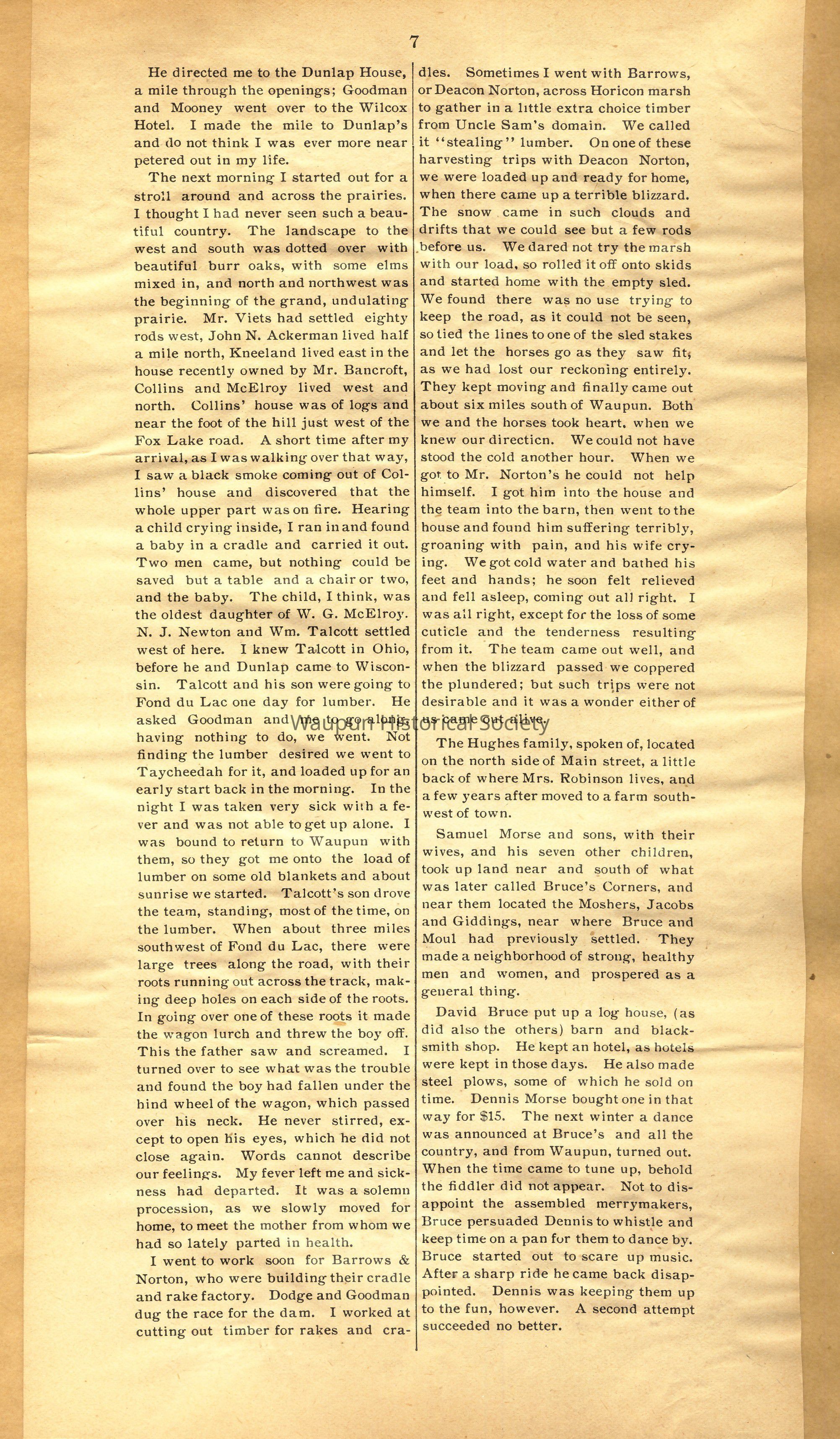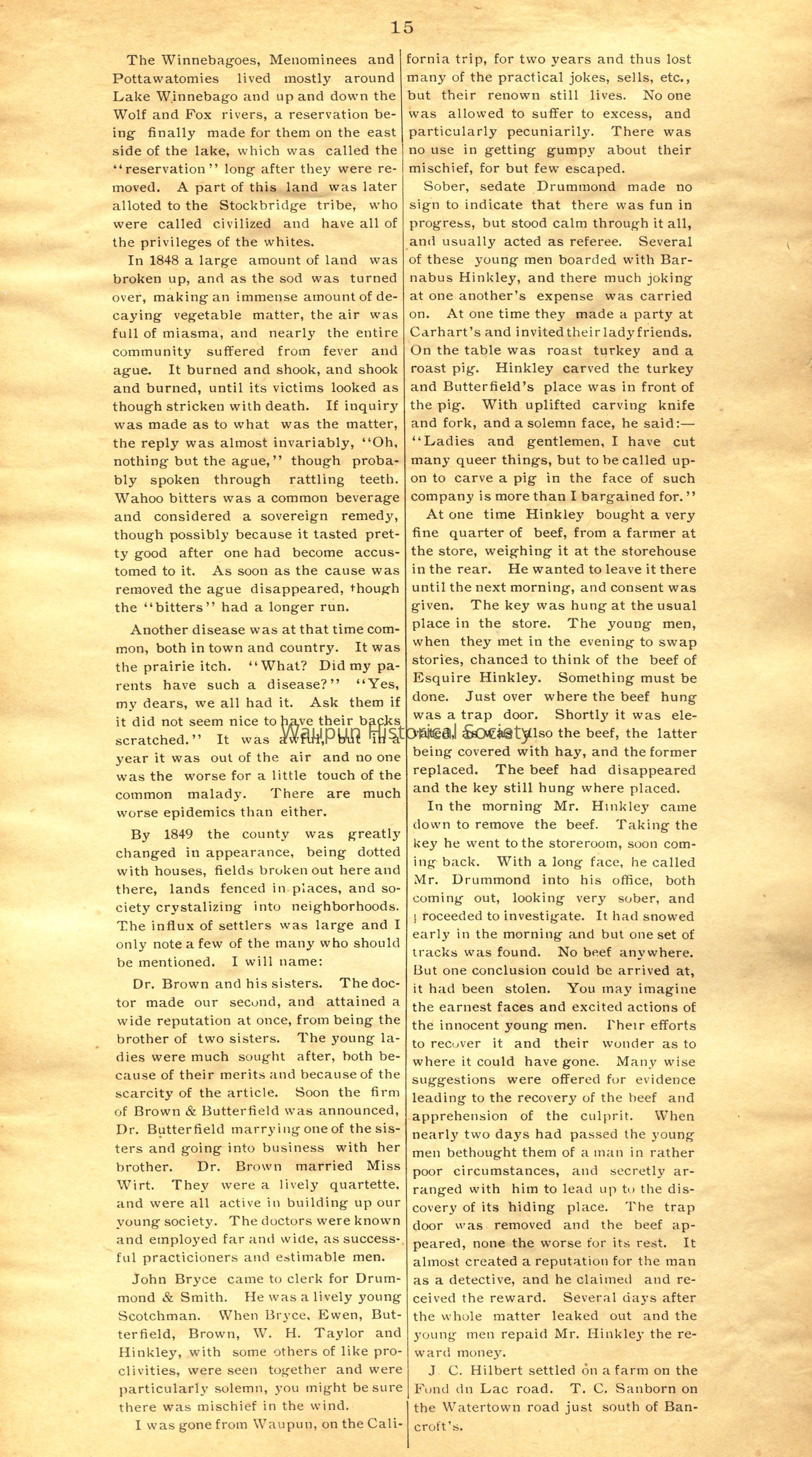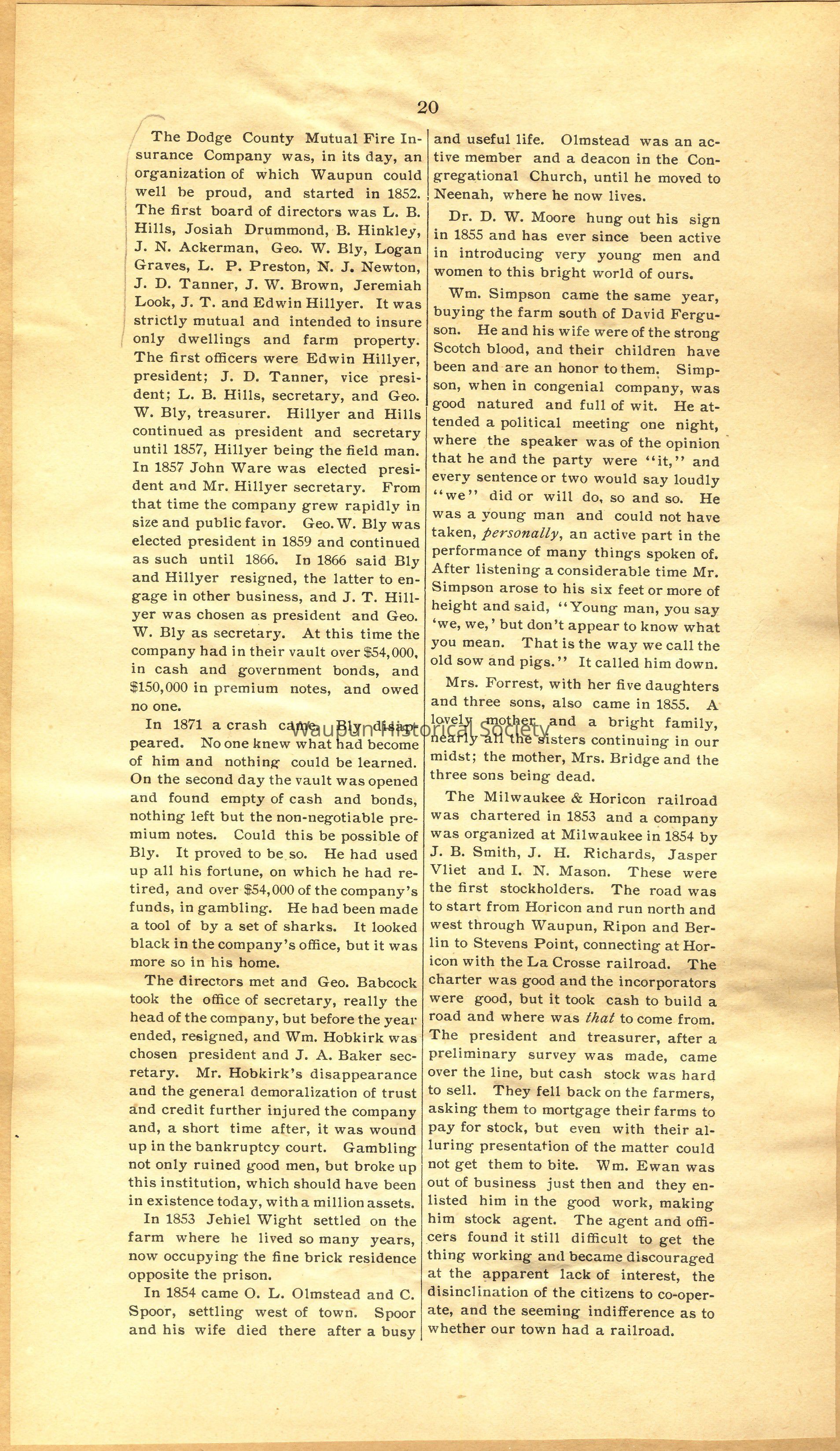 However brief and sketchy a history of the city this may be, it will necessarily include the names and mention of old settlers in the vicinity, both in Dodge and Fond du Lac Counties. More than fifty years have passed, numerous names that should be mentioned do not occur to me, and many events that would he of general and personal interest have been forgotten. In those remembered, the exact coloring has, due to such lapse of time and a busy life, become blurred, and it is beyond my powers to so bring them before you, as to cause you to realize the place and surroundings. I can only say that, so far as I am able, the truth shall be told, though not possible to tell it all.