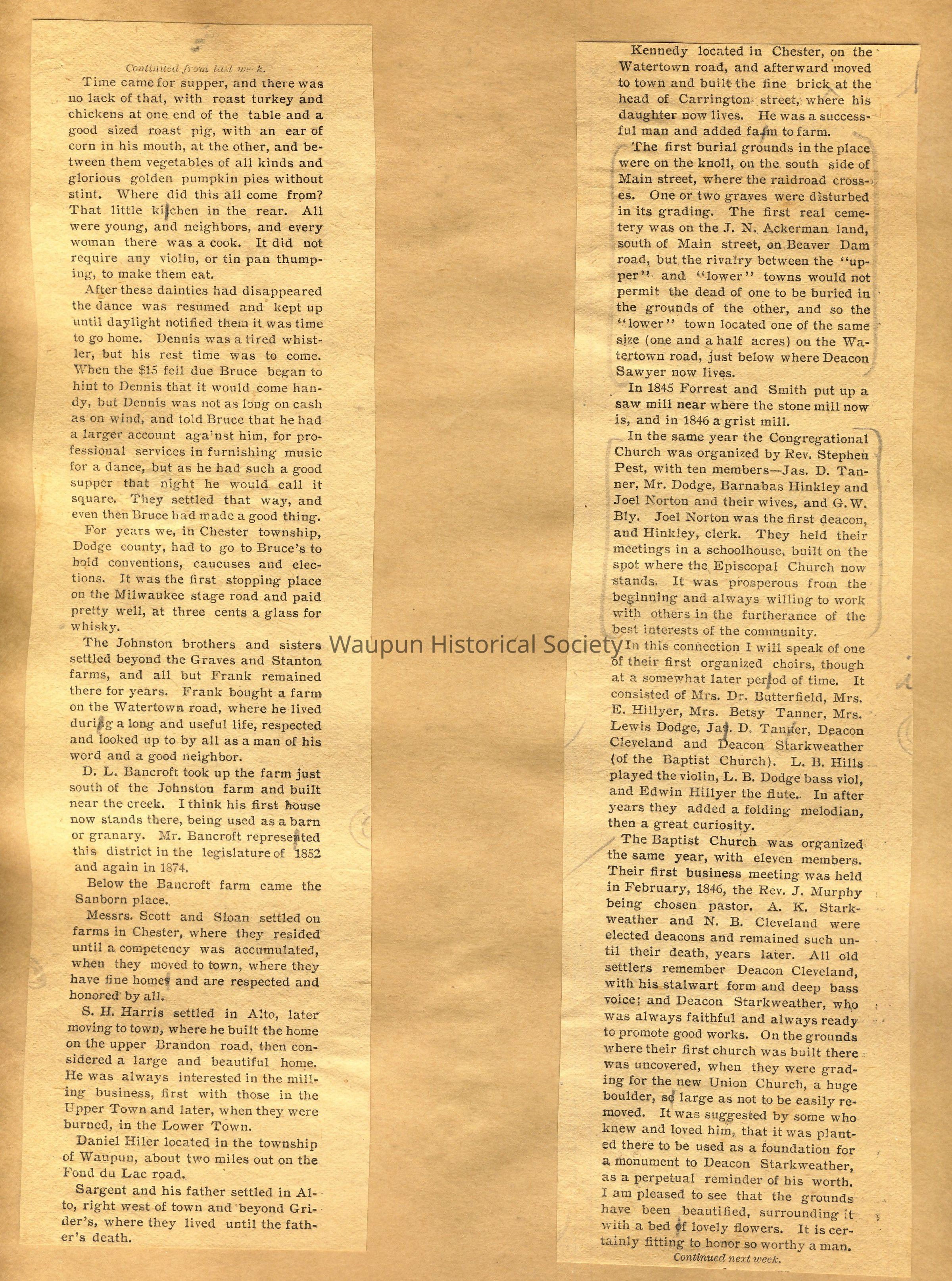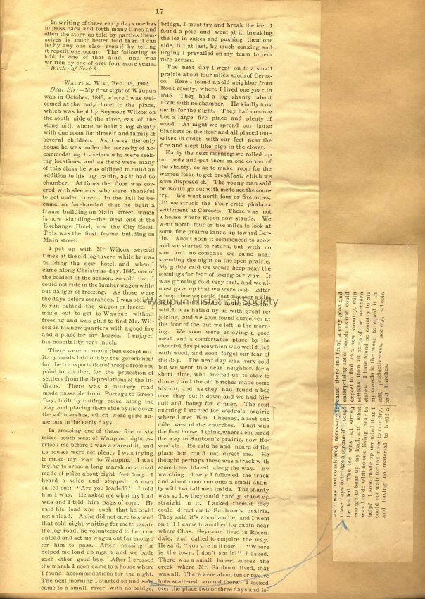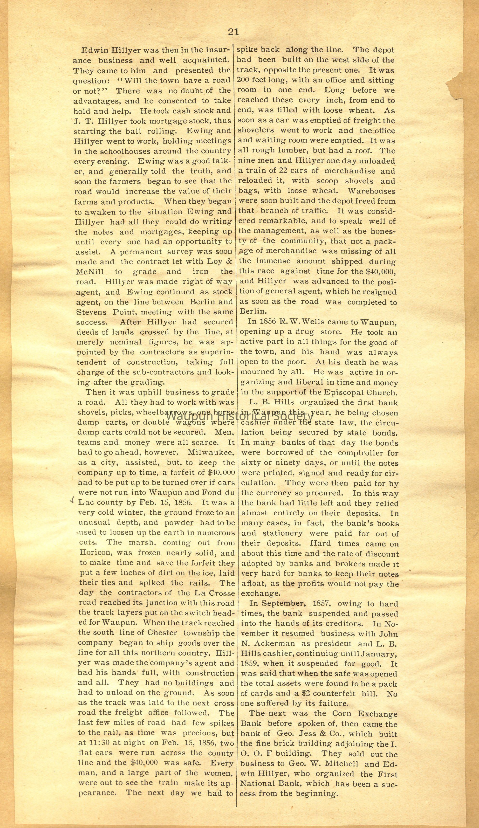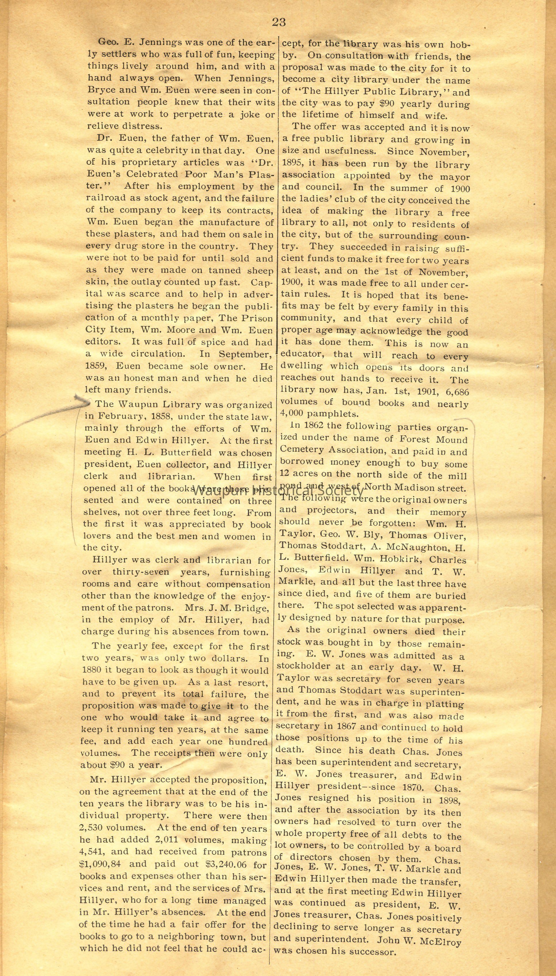Extended Description: Newspaper article from the Waupun Leader News of 190l placed in a cardboard like folder which was from the Waupun Public Library. This was dated Friday, December 13, 1901. **There is another copy of this newspaper article in a black leather bound book labeled, "Cash Book", with F. Ford, Waupun, Wis. hand written inside page. Will indicate this as a duplicate with same object ID for computer information. This book was found November 17, 2015 in the Waupun Heritage Museum.