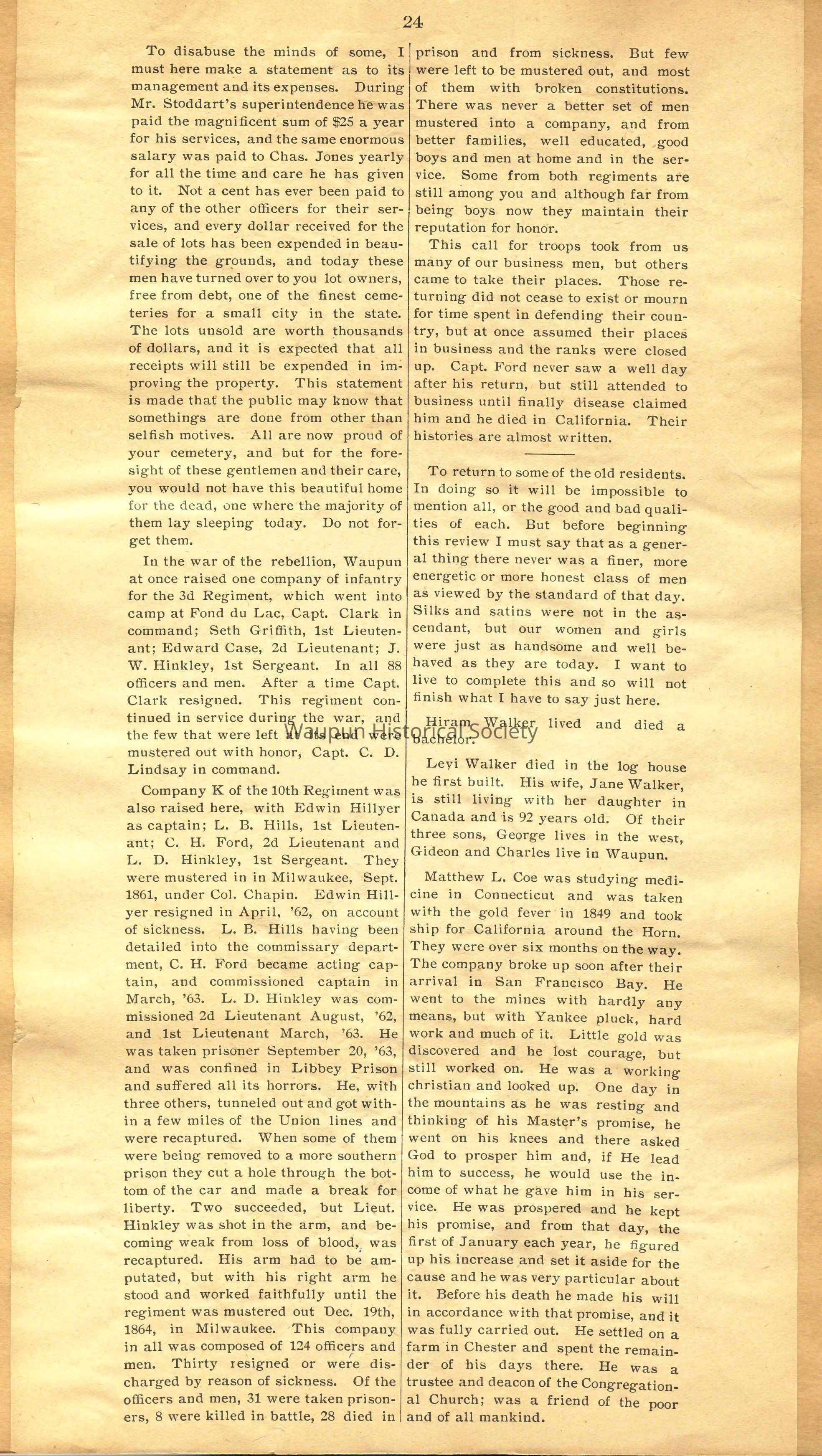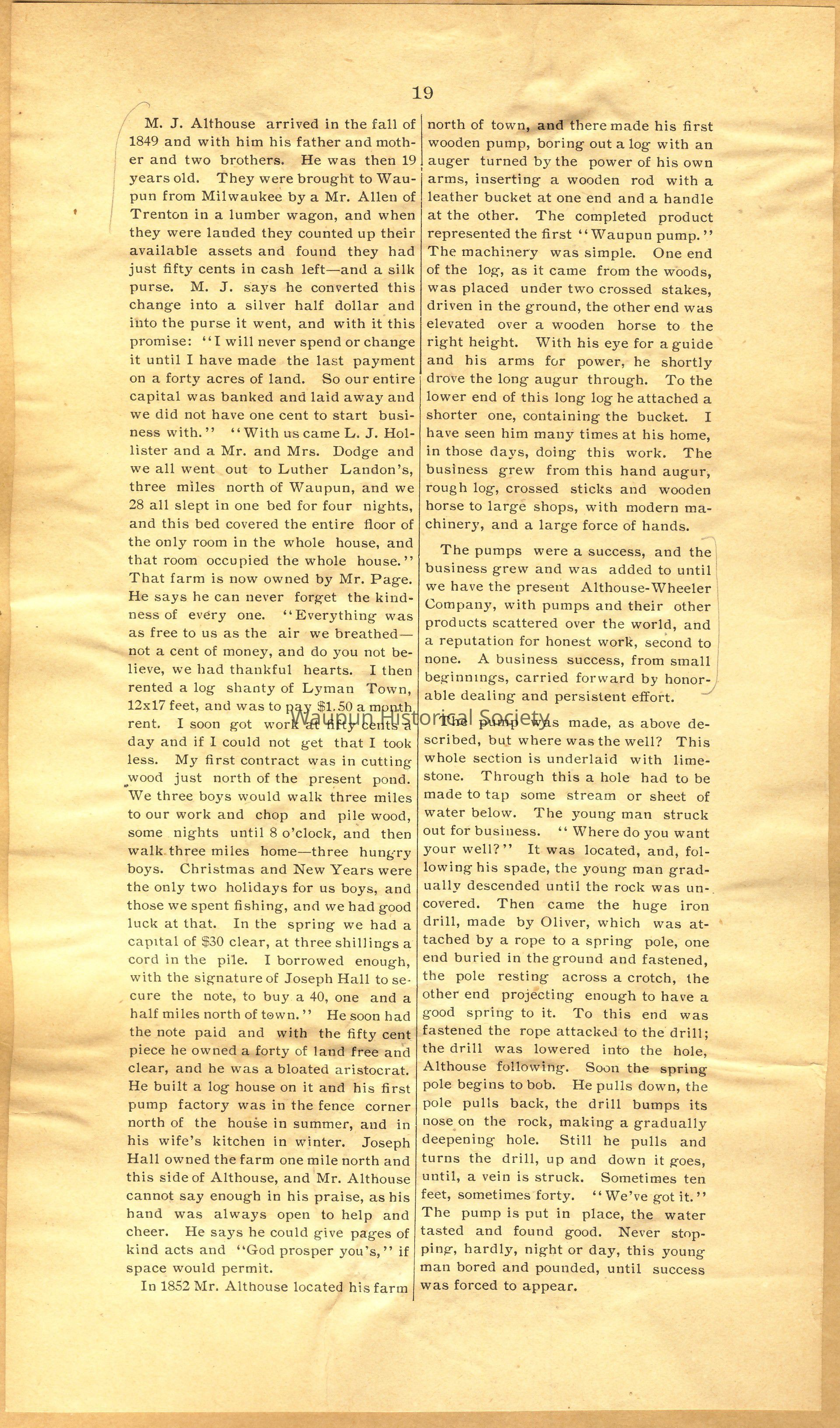 Newspaper article from the Waupun Leader News of 190l placed in a cardboard like folder which was from the Waupun Public Library. This was dated Friday, December 13, 1901. **There is another copy of this newspaper article in a black leather bound book labeled, "Cash Book", with F. Ford, Waupun, Wis. hand written inside page. Will indicate this as a duplicate with same object ID for computer information. This book was found November 17, 2015 in the Waupun Heritage Museum.