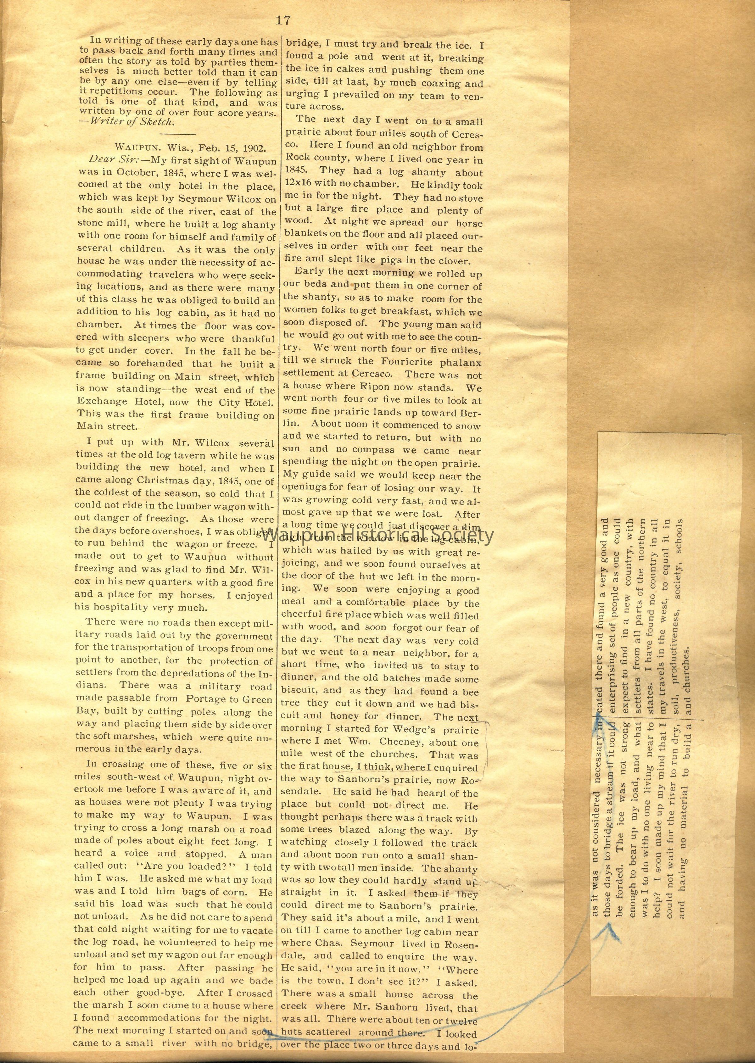The palatial hotel was situated on the Indian trail from Fort Howard, opposite where Green Bay stands, to Fort Winnebago, which was about one mile east of where Portage City now is, on the east bank of Fox river, just to the right of the present public road from Randolph to Portage. Some of the old block buildings of this fort are yet standing; one, when I was last there, being used as a barn. It has the big chimneys and immense open fire places, such as Uncle Sam, in those days, put in his buildings.
