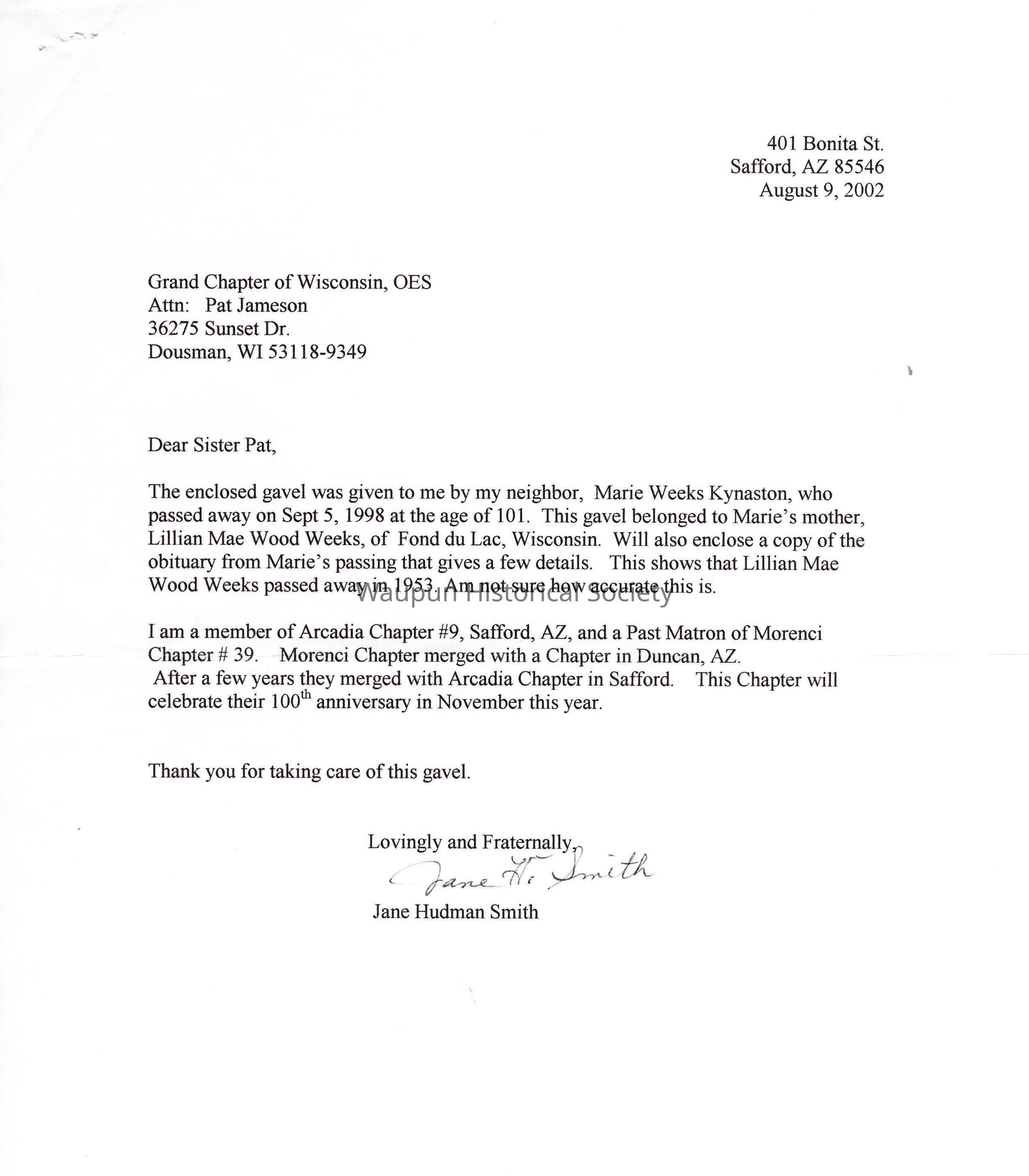 The enclosed gavel was given to me by my neighbor, Marie Weeks Kynaston, who passed away on Sept 5, 1998 at the age of 101. This gavel belonged to Marie's mother, Lillian Mae Wood Weeks, of Fond du Lac, Wisconsin. Will also enclose a copy of the obituary from Marie's passing that gives a few details. This shows that Lillian Mae Wood Weeks passed away in 1953. Am not sure how accurate this is.