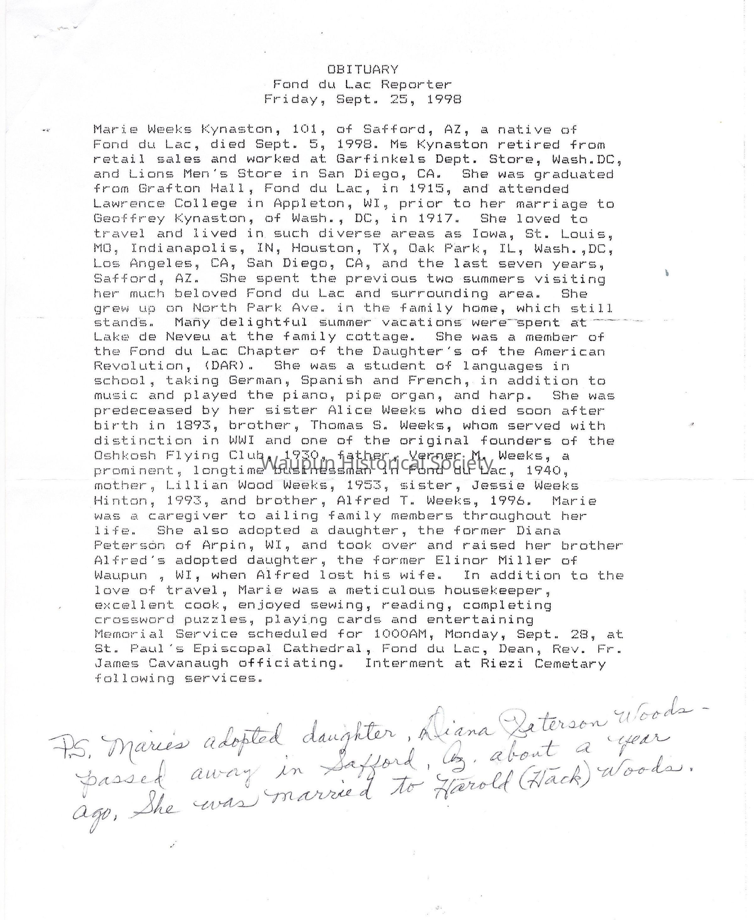 Marie Weeks Kynaston, 101, of Safford, AZ, a native of Fond du Lac, died Sept. 5, 1998. Ms Kynaston retired from retail sales and worked at Garfinkels Dept. Store, Wash. DC, and Lions Men's Store in San Diego, CA. She was graduated from Grafton Hall, Fond du Lac, in 1915, and attended Lawrence College in Appleton, WI, prior to her marriage to Geoffrey Kynaston, of Wash., DC, in 1917. She loved to travel and lived in such diverse areas as Iowa, St. Louis, MO, Indianapolis, IN, Houston, TX, Oak Park, IL, Wash.,DC, Los Angeles, CA, San Diego, CA, and the last seven years, Safford, AZ. She spent the previous two summers visiting her much beloved Fond du Lac and surrounding area. She grew up on North Park Ave. in the family home, which still stands. Many delightful summer vacations were spent at Lake de Neveu at the family cottage. She was a member of the Fond du Lac Chapter of the Daughter's of the American Revolution, (DAR). She was a student of languages in school, taking German, Spanish and French, in addition to music and played the piano, pipe organ, and harp. She was predeceased by her sister Alice Weeks who died soon after birth in 1893, brother, Thomas S. Weeks, whom served with distinction in WWI and one of the original founders of the Oshkosh Flying Club, 1930, father, Verner M. Weeks, a prominent, longtime businessman in Fond du Lac, 1940, mother, Lillian Wood Weeks, 1953, sister, Jessie Weeks Hinton, 1993, and brother, Alfred T. Weeks, 1996. Marie was a caregiver to ailing family members throughout her life. She also adopted a daughter, the former Diana Peterson of Arpin, WI, and took over and raised her brother Alfred's adopted daughter, the former Elinor Miller of Waupun , WI, when Alfred lost his wife. In addition to the love of travel, Marie was a meticulous housekeeper, excellent cook, enjoyed sewing, reading, completing crossword puzzles, playing cards and entertaining.