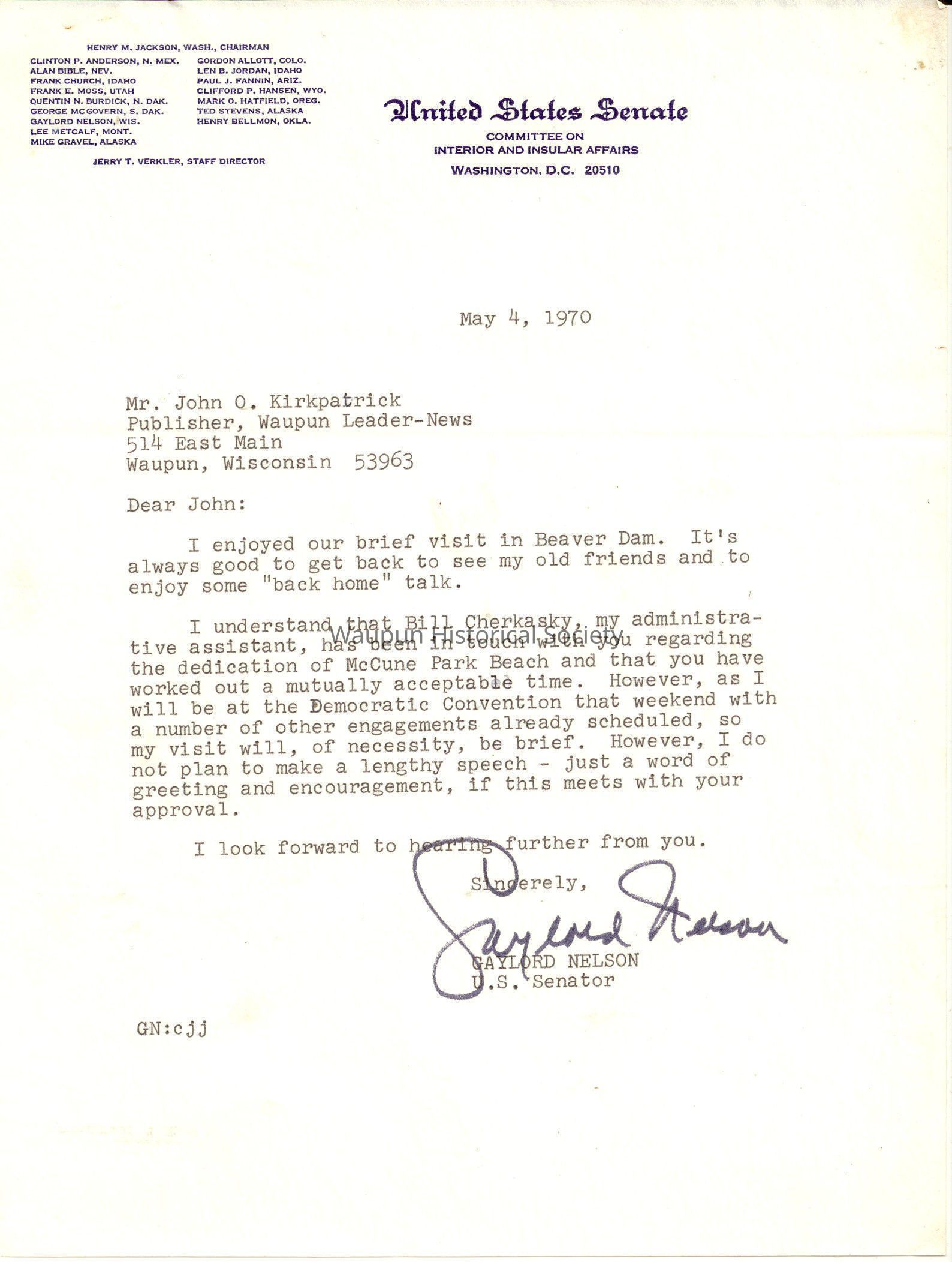 Parks, McCune Beach, Letter, Gaylord NelsonEntry/Object ID
