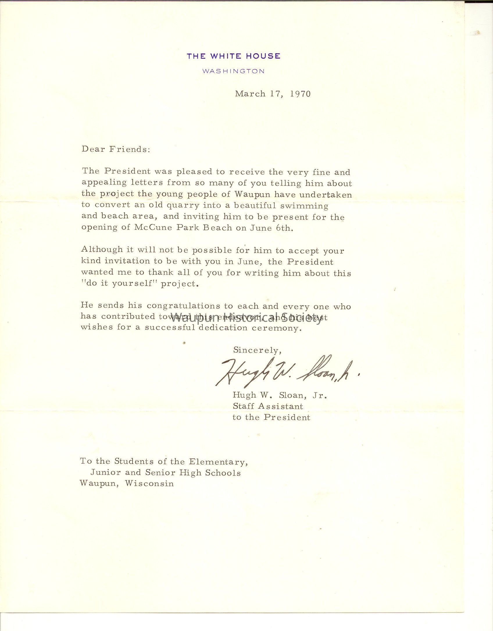 The President was pleased to receive the very fine and appealing letters from so many of you telling him about the project the young people of Waupun have undertaken to convert an old quarry into a beautiful swimming and beach area, and inviting him to be present for the opening of McCune Park Beach on June 6th.