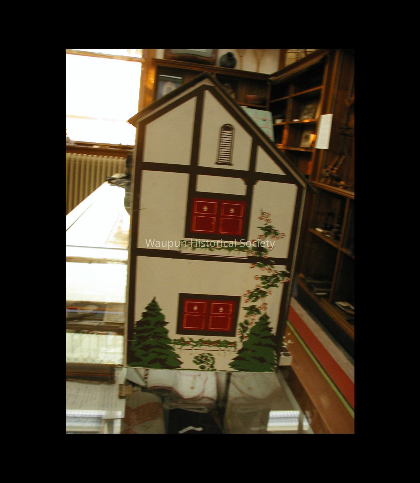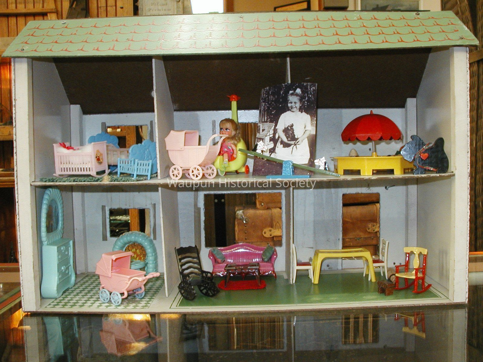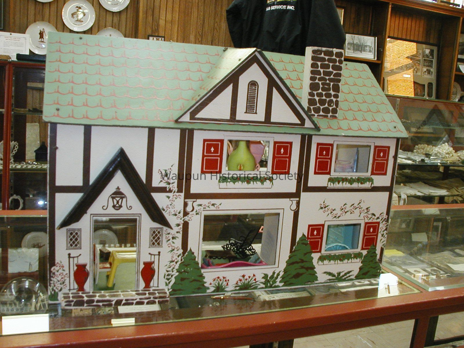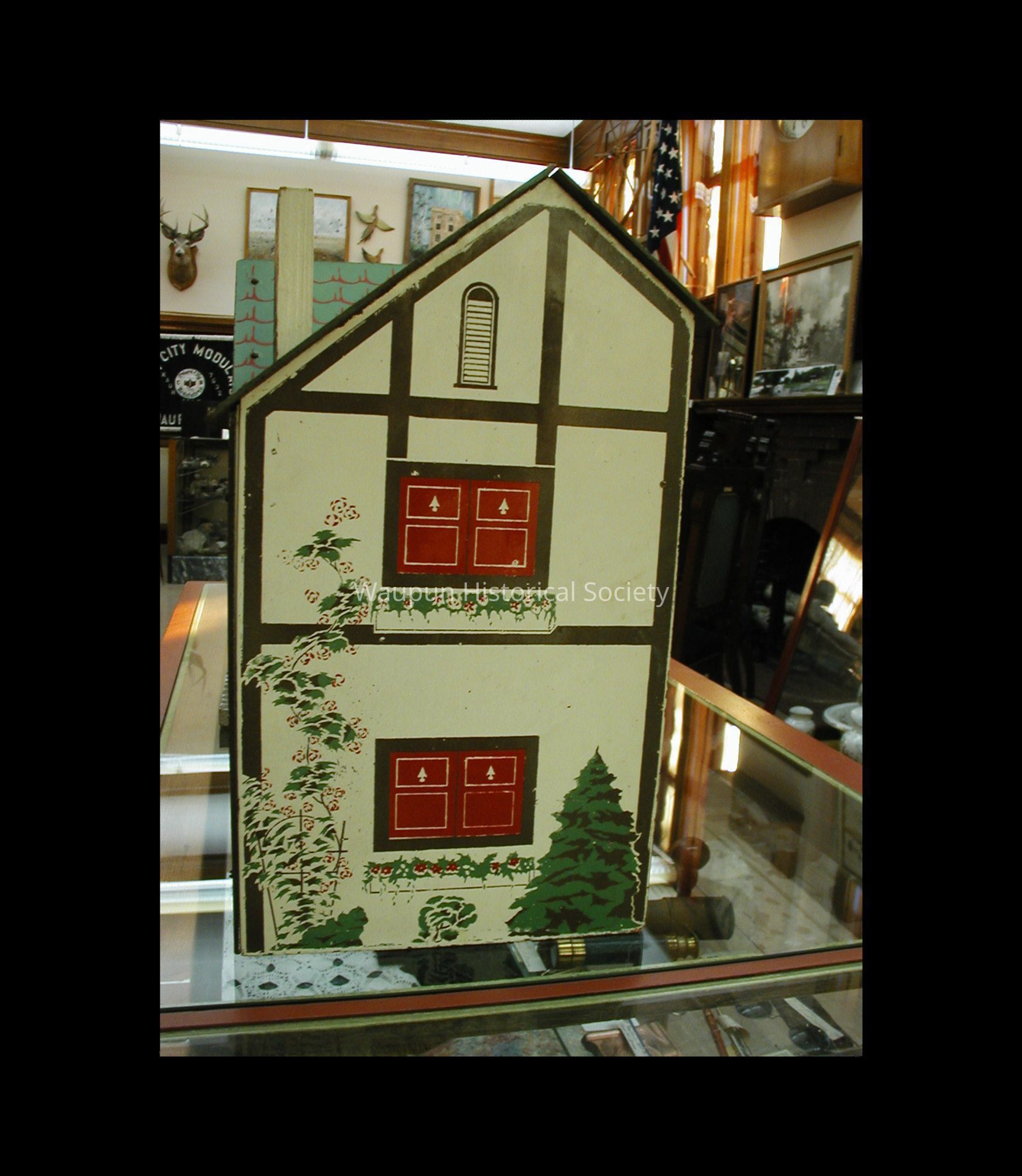This is a child's doll house probably made in the fifties. It is a 2 story white house with a green roof, black trim and red shutters and is made of pressed wood.