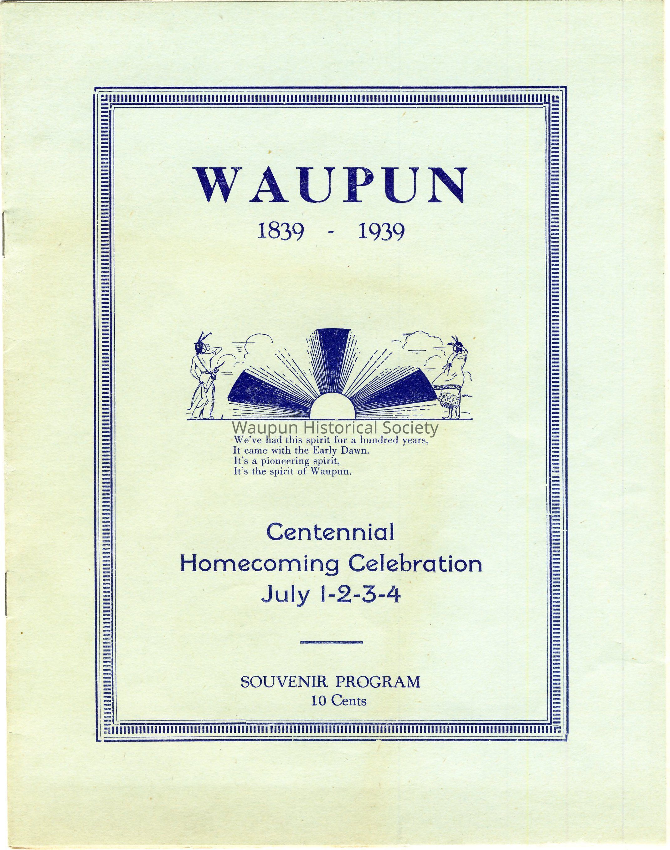 Souvenir Program (10 cents) from WAUPUN 1839 - 1939 Centennial Homecoming Celebration, July 1-2-3-4, 1939
