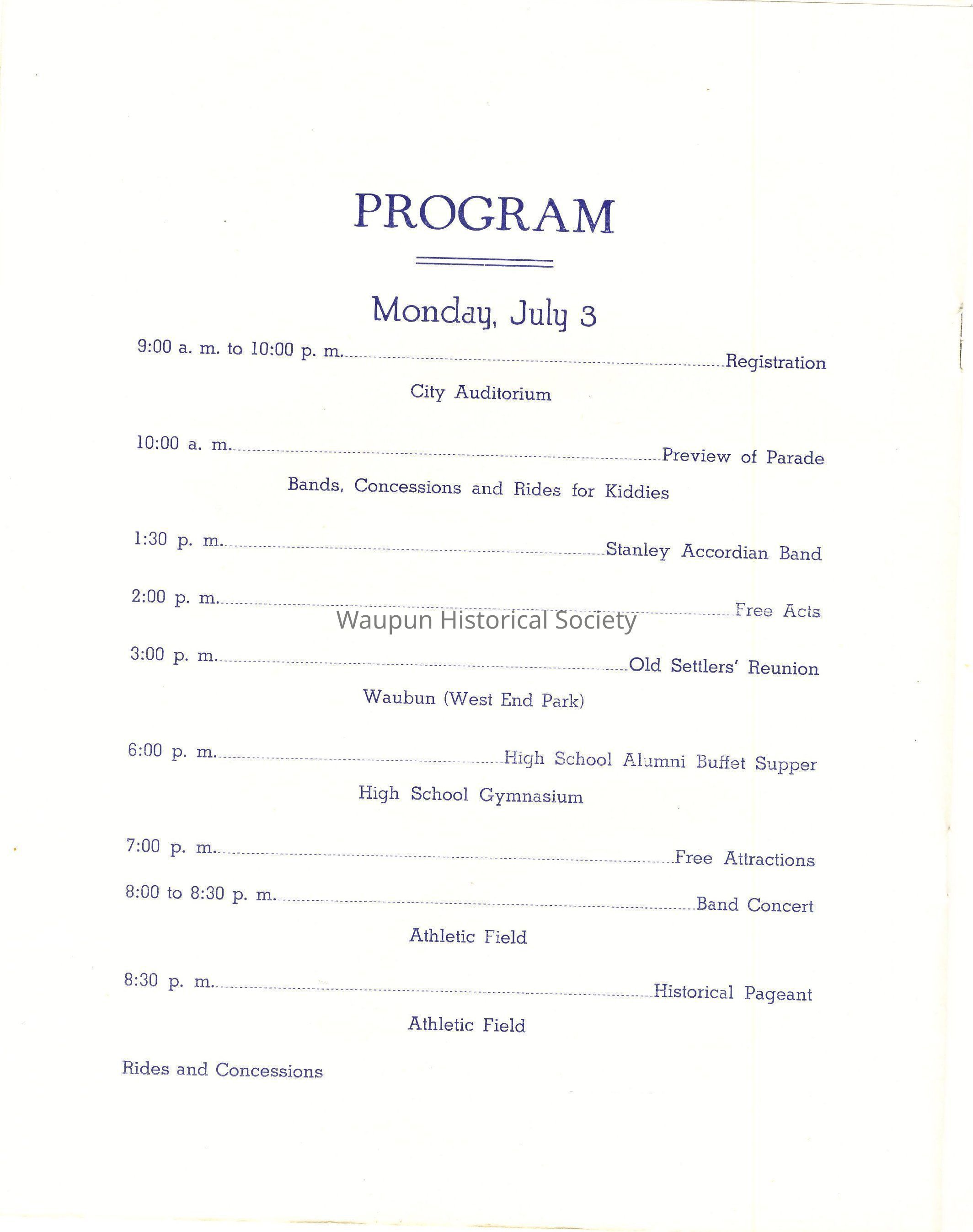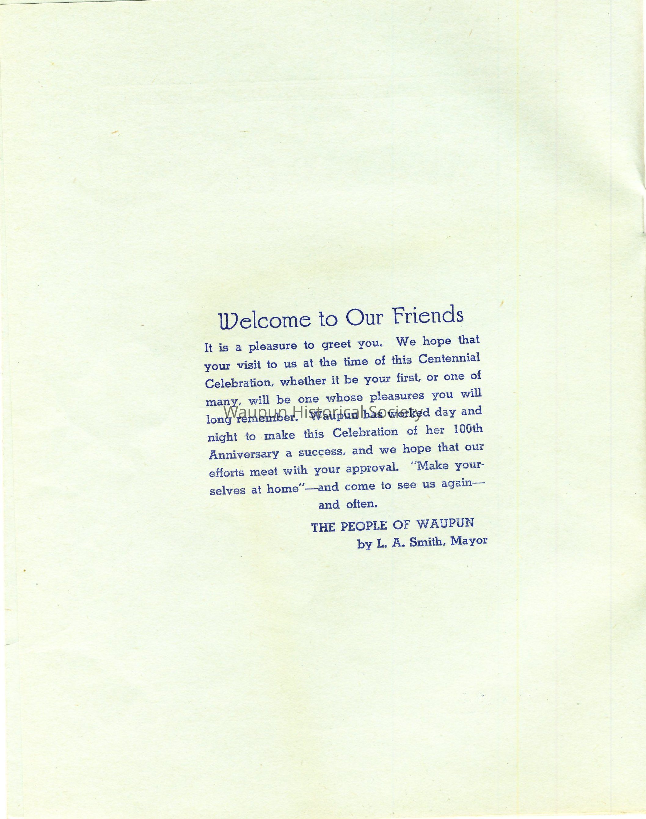 It is a pleasure to greet you. We hope that your visit to us at the time of this Centennial Celebration, whether it be your first, or one of many, will be one whose pleasures you will long remember. Waupun has worked day and night to make this Celebration of her 100th Anniversary a success, and we hope that our efforts meet with your approval. "Make yoursevles at home"- and come to see us again - and often.