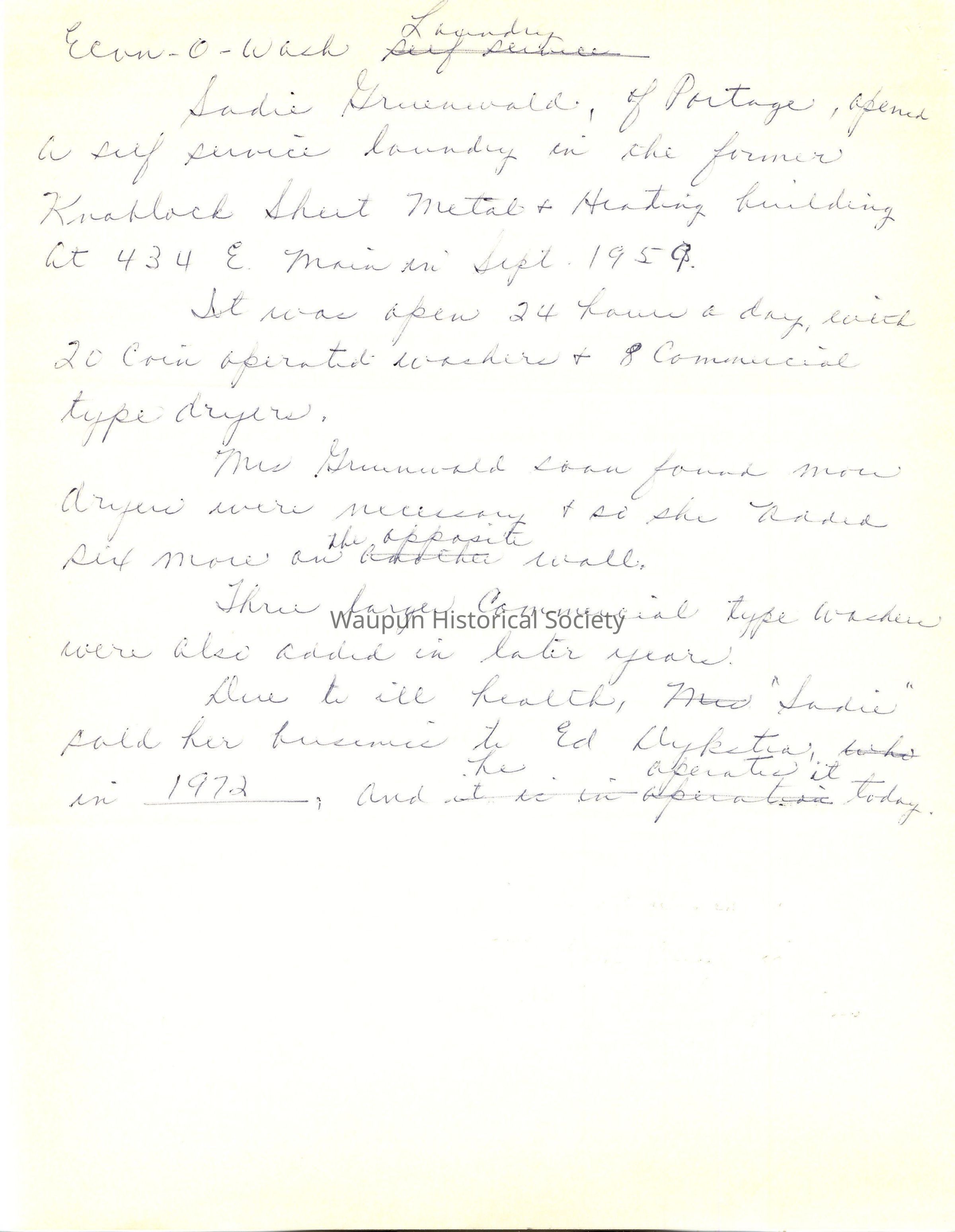 Sadie Gruenwald, of Portage, opened a self service laundry in the former Knoblock Sheet Metal & Heating building at 434 E. Main in September 1959.