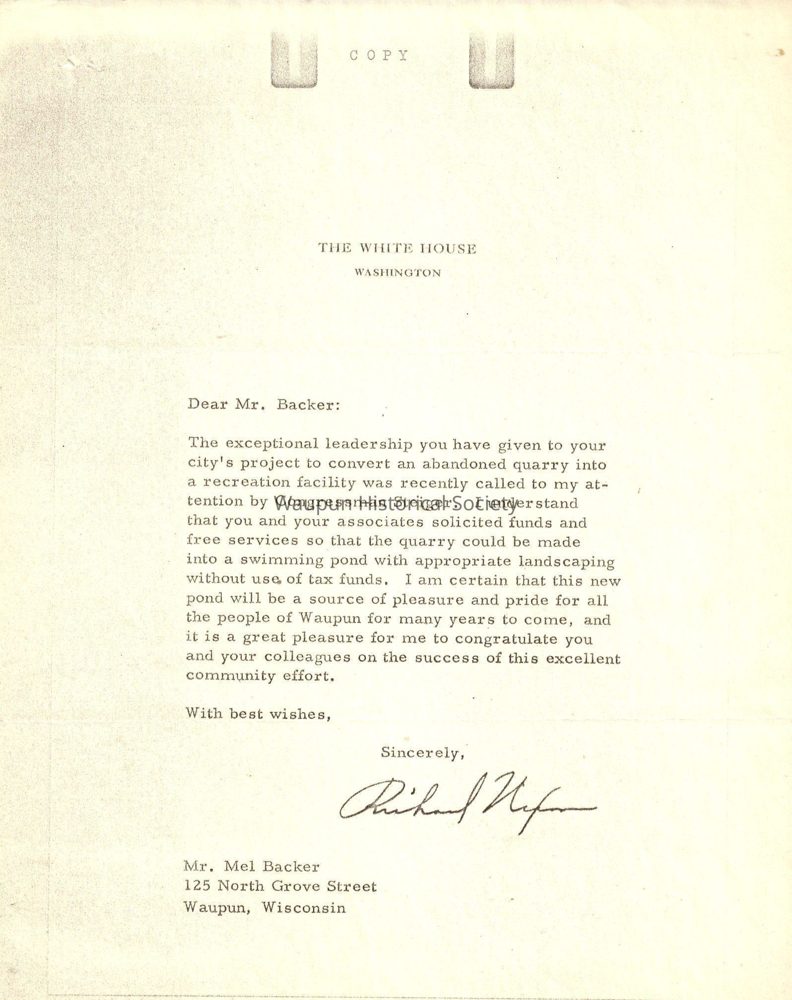 that you and. your associates solicited funds and free services so that the quarry could be made into a swimming pond with appropriate landscaping without use. of tax funds, I am certain that this new pond. will be a source of pleasure and pride for all the people of Waupun for many years to come, and it is a great pleasure for me to congratulate you and your colleagues on the success of this excellent community effort.