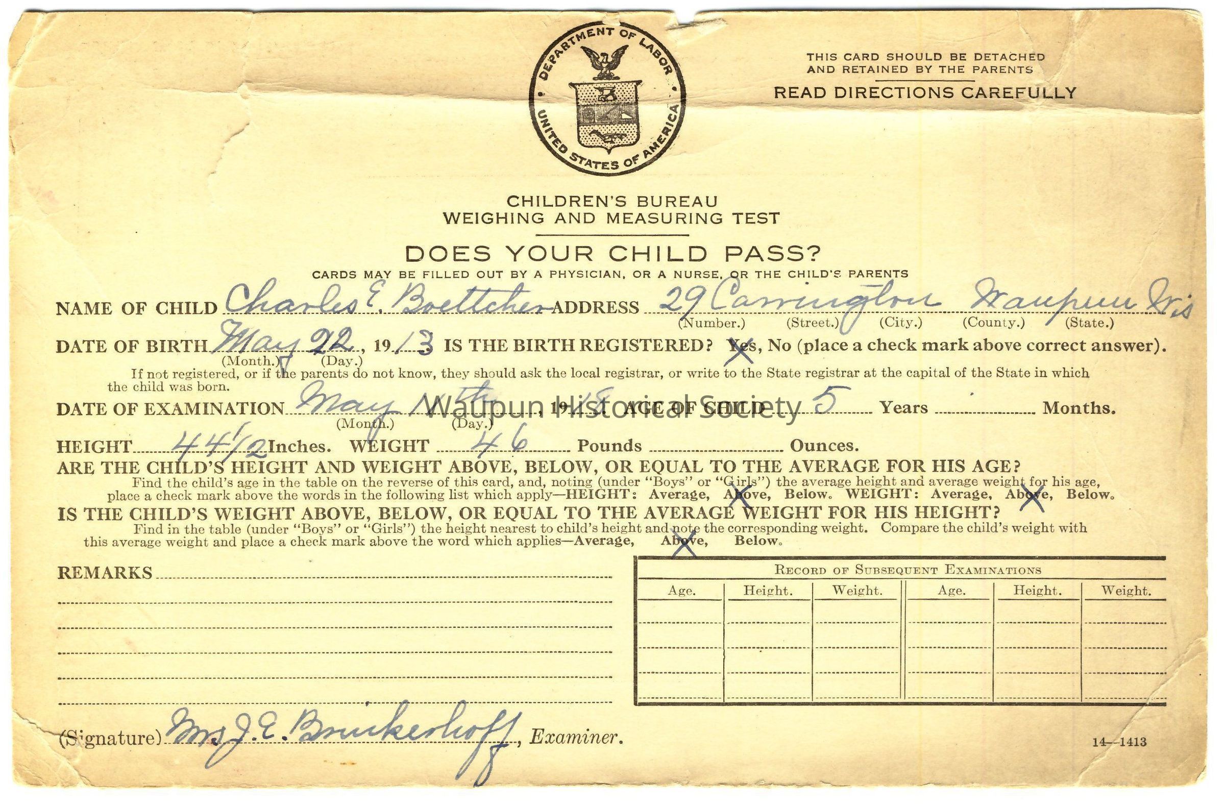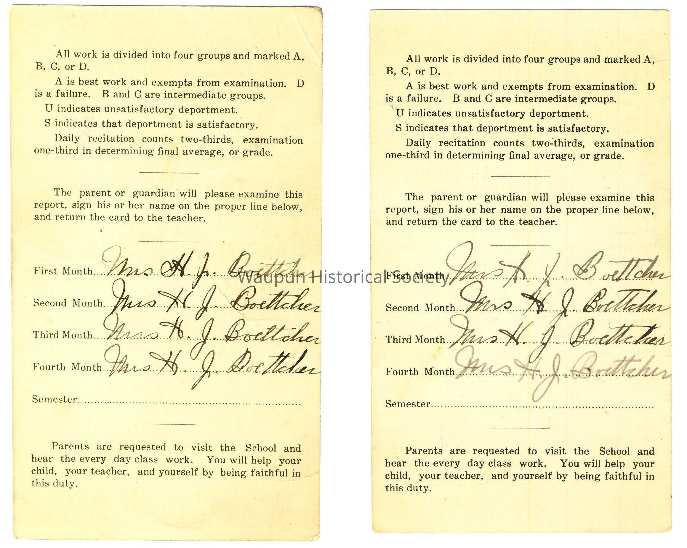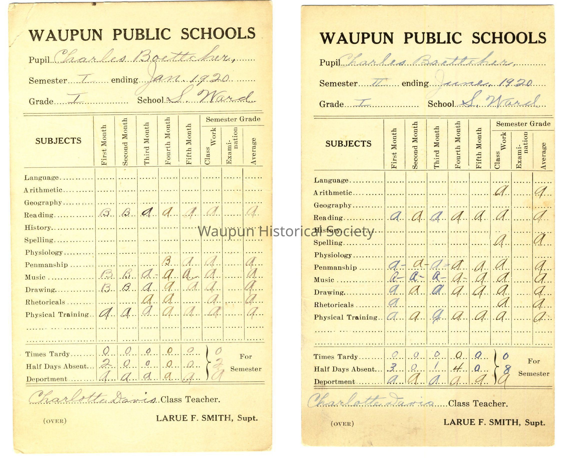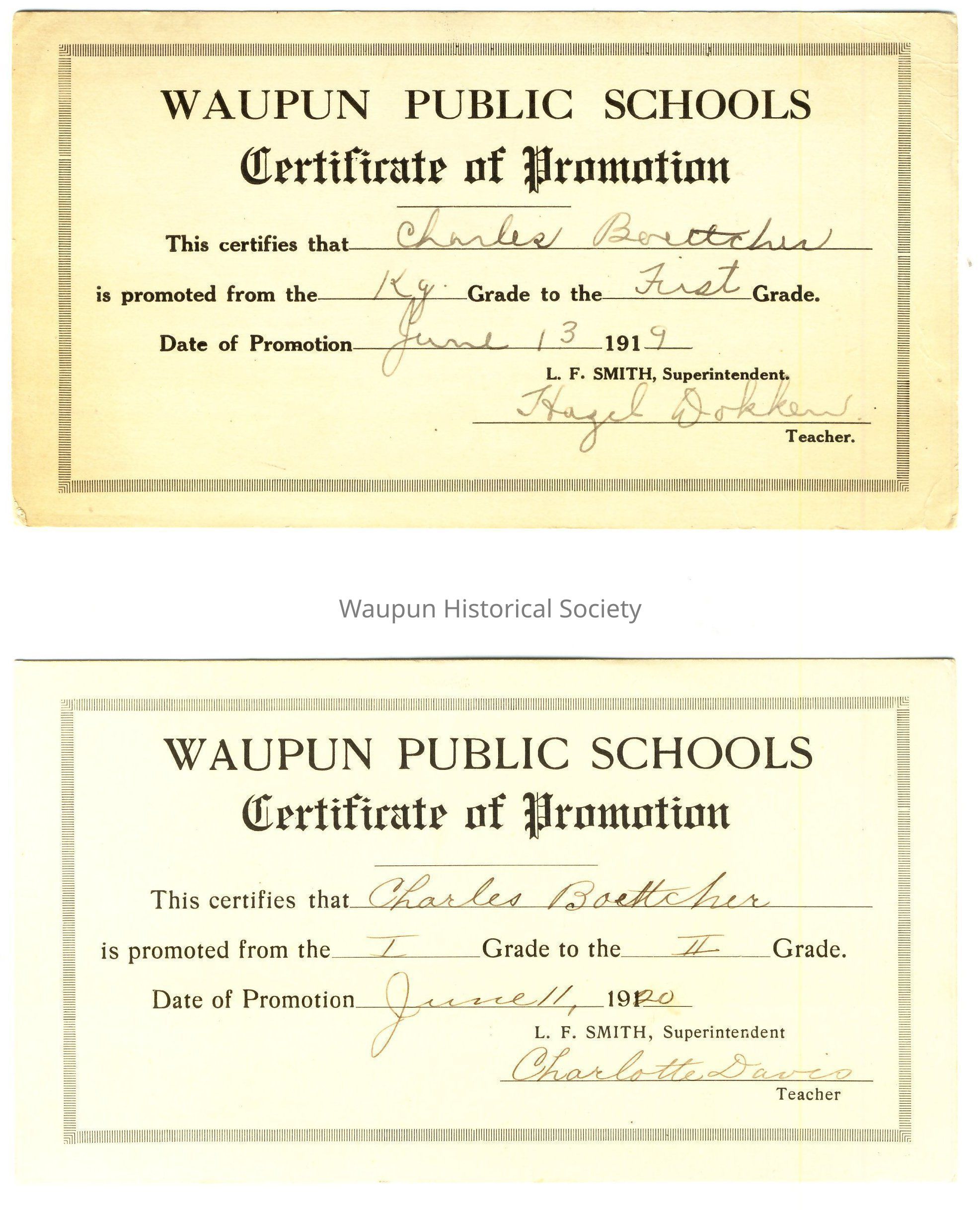 Items from Roy R. Curtis - numerous Reward of Merit cards, report cards from 1918,1919, and 1920, and cards of promotion from one grade to another. The picture of the Waupun High School is of when it was on the site of the New Library.