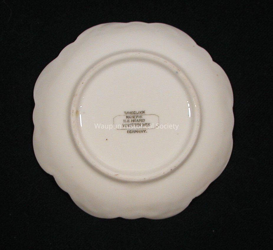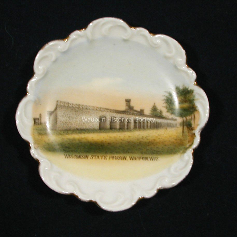Plate with prison on it. The picture shows the prison and the words, "Wisconsin State Prison, Waupun, Wis." On the back it indicates Wheelock, Made for H. H. Hoard, Waupun, Wis Germany." Purchased by Jim Laird on eBay.Acquisition