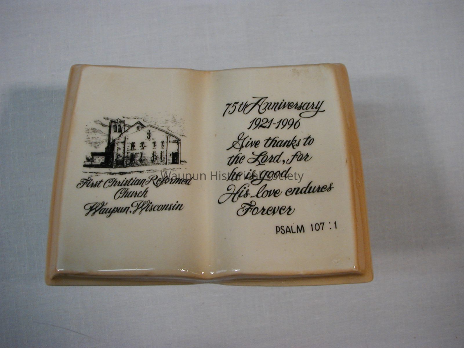 Vase from "First Christian Reformed Church, Waupun, Wisconsin." This was for their "75th Anniversary, 1921-1996. Give thanks to the Lord, for he is good His love endures Forever, Psalm 107:1"Acquisition