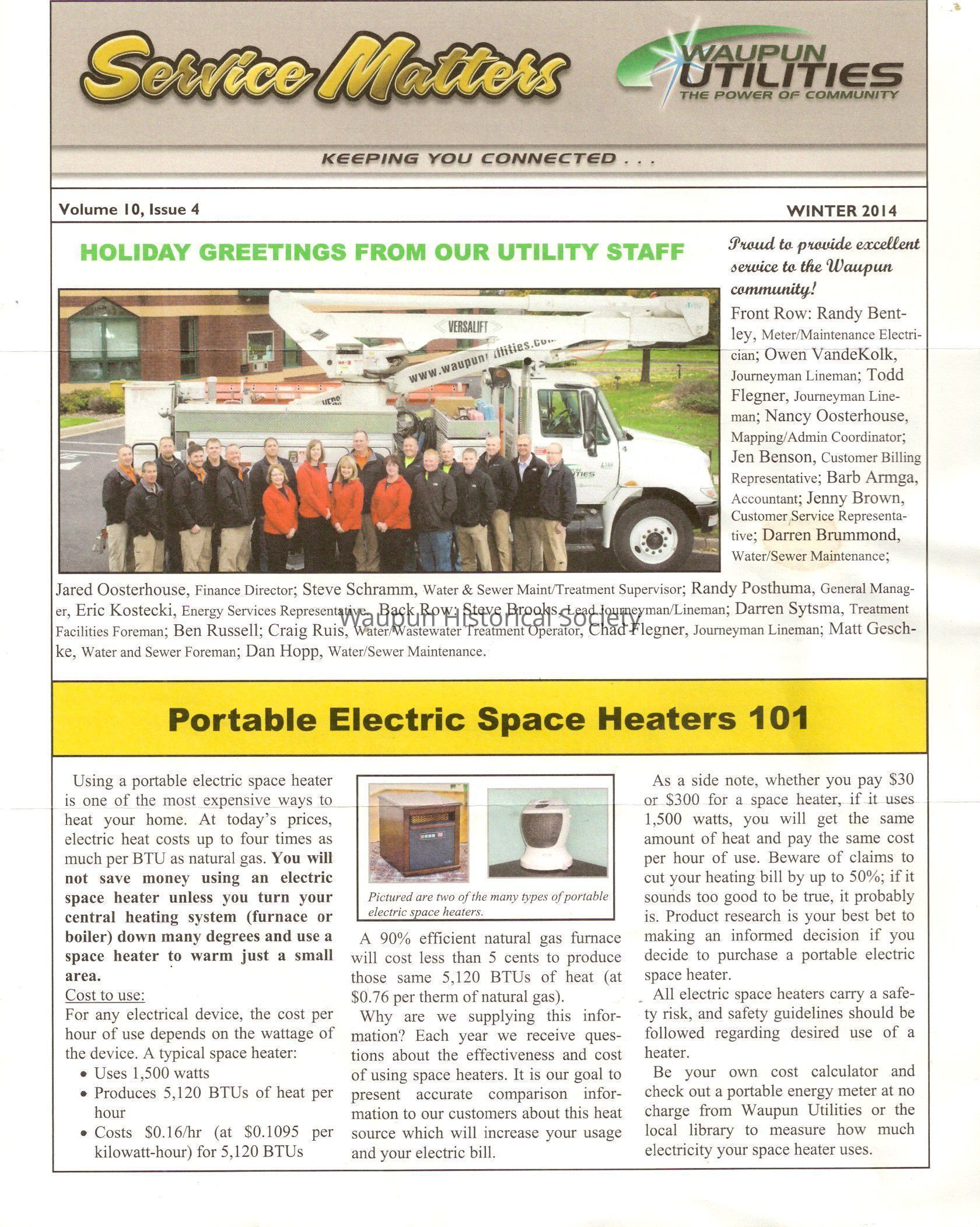 Be your own cost calculator and check out a portable energy meter at no charge from Waupun Utilities or the local library to measure how much electricity your space heater uses.