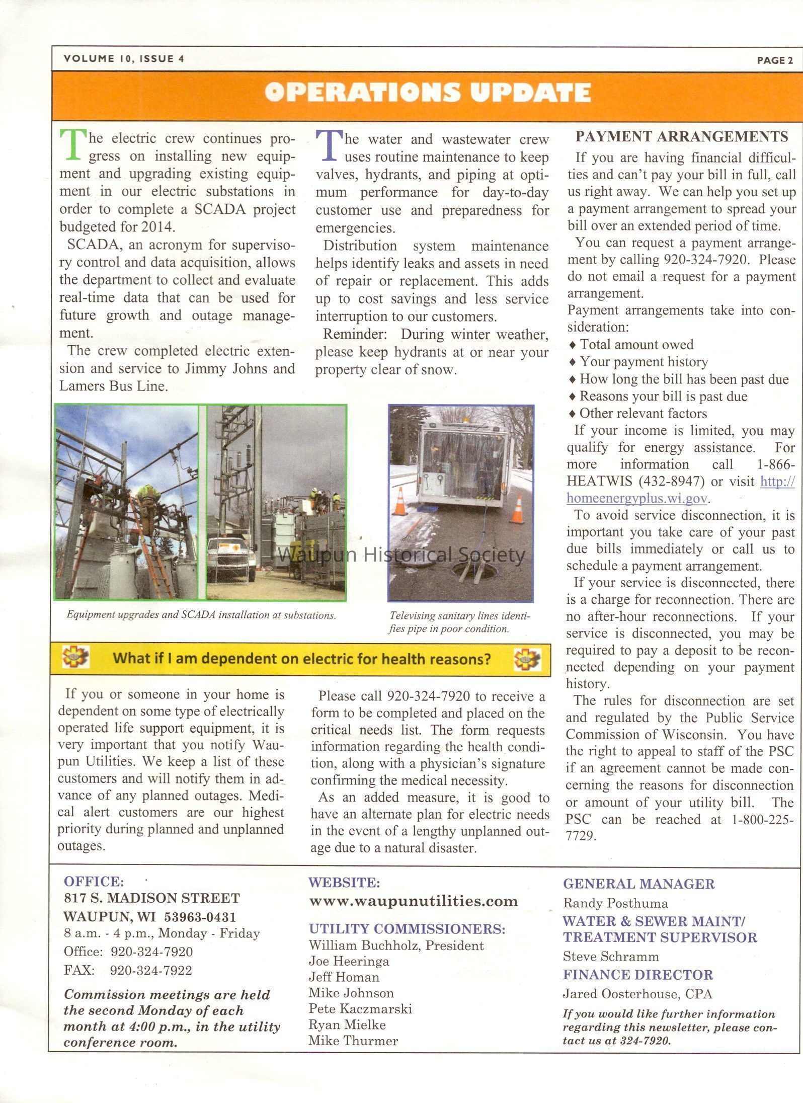 The electric crew continues progress on installing new equipment and upgrading existing equipment in our electric substations in order to complete a SCADA project budgeted for 2014.