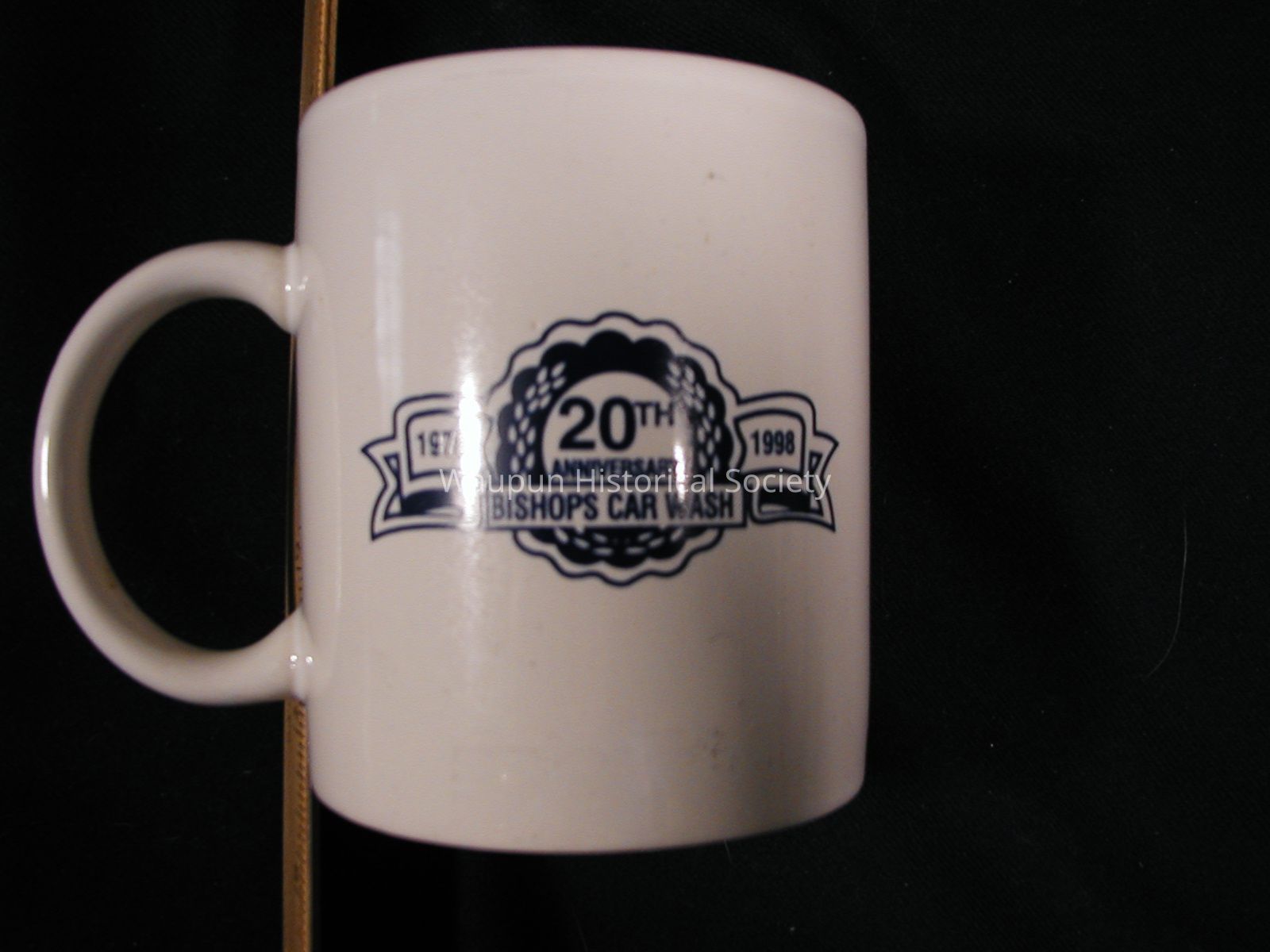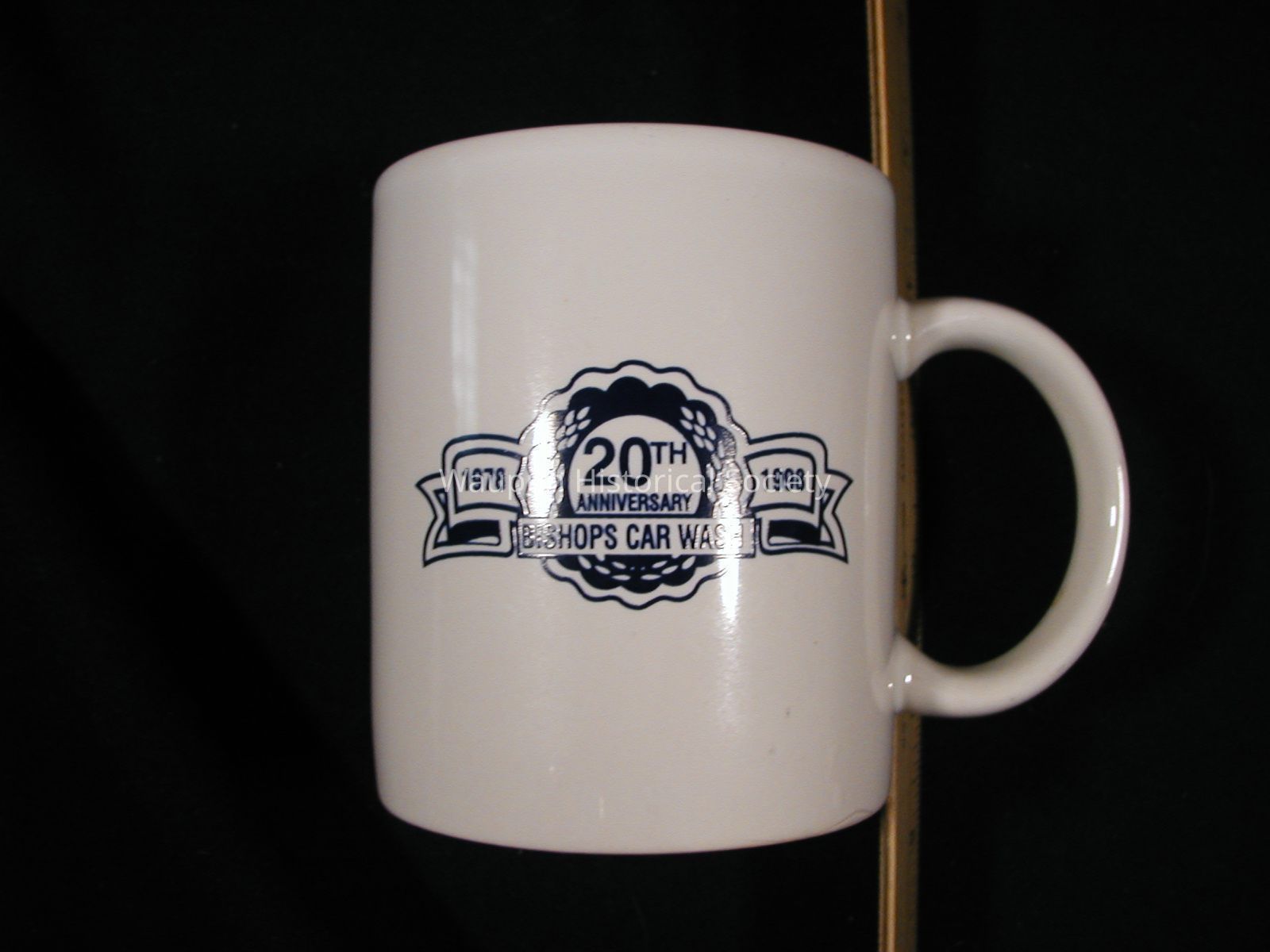 1 Coffee Cup from Bishop's Car Wash. Bishops was having a 20th anniversary and presented this coffee cup. On the cup it indicates: "1978 - 1998 20th Anniversary, Bishop's Car Wash."Acquisition