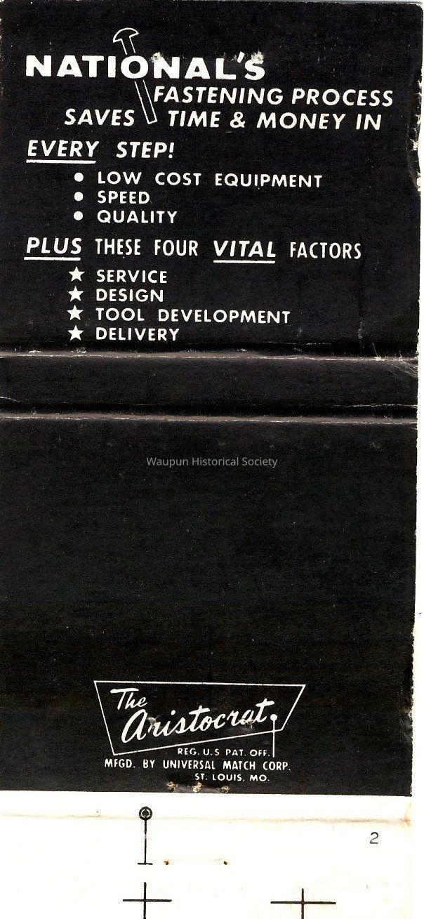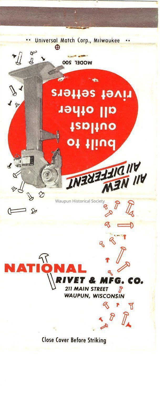 National Rivet, Matchbook advertising Waupun business - National Rivet & Mfg. Co., 211 Main Street, Waupun, Wisconsin