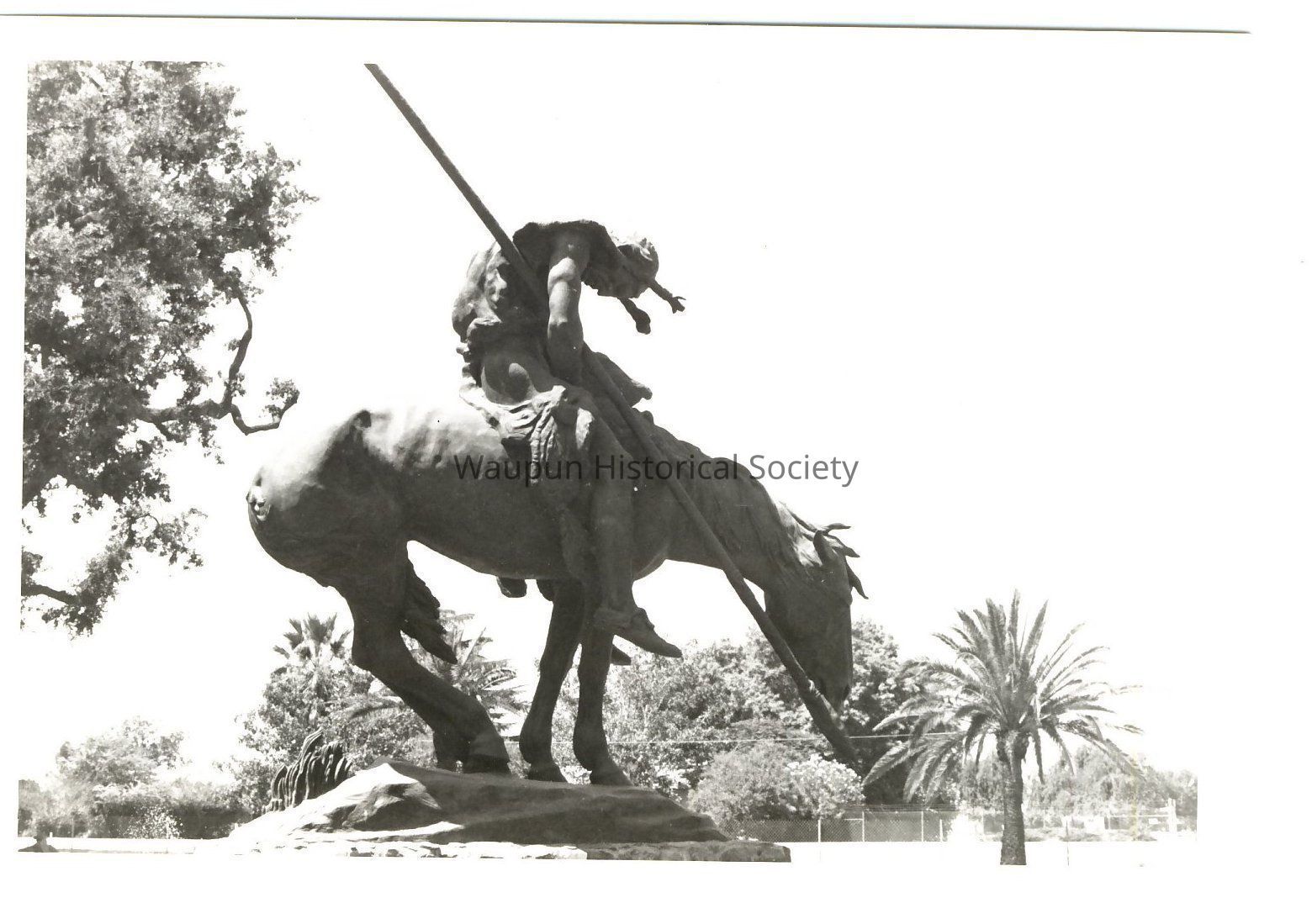 Black and white photo of The End of The Trail statue when in Calif. before it was moved to the Cowboy Hall of Fame in Oklahoma City and then to Waupun, WI.